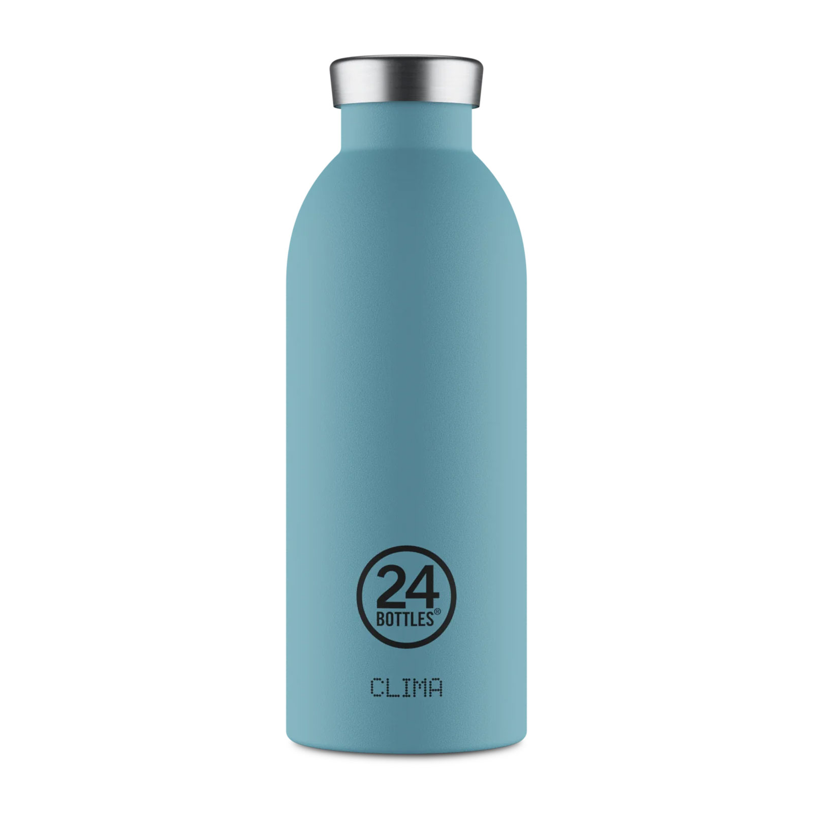 Au-delà de la sécurité de la prise en main, la Finition Stone contribue également à la résistance de la bouteille. Elle agit comme une couche protectrice contre les petits chocs, les rayures et l’usure quotidienne, assurant ainsi une grande durabilité. Le design élégant est accentué par des détails subtils, comme le logo “24 BOTTLES” et l’inscription “CLIMA”, qui sont clairement visibles et ajoutent une touche de sophistication à cette forme épurée et moderne.