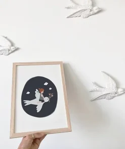 Magnifique encadrée dans un cadre en bois ou posée sur une commode, cette affiche L’enfant et l’hirondelle sera du plus bel effet dans une chambre d’enfant ou de bébé.