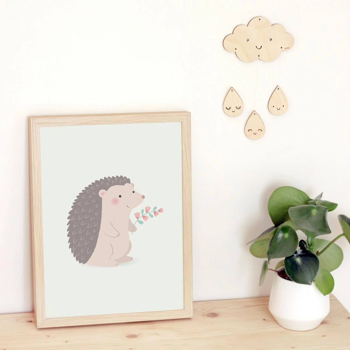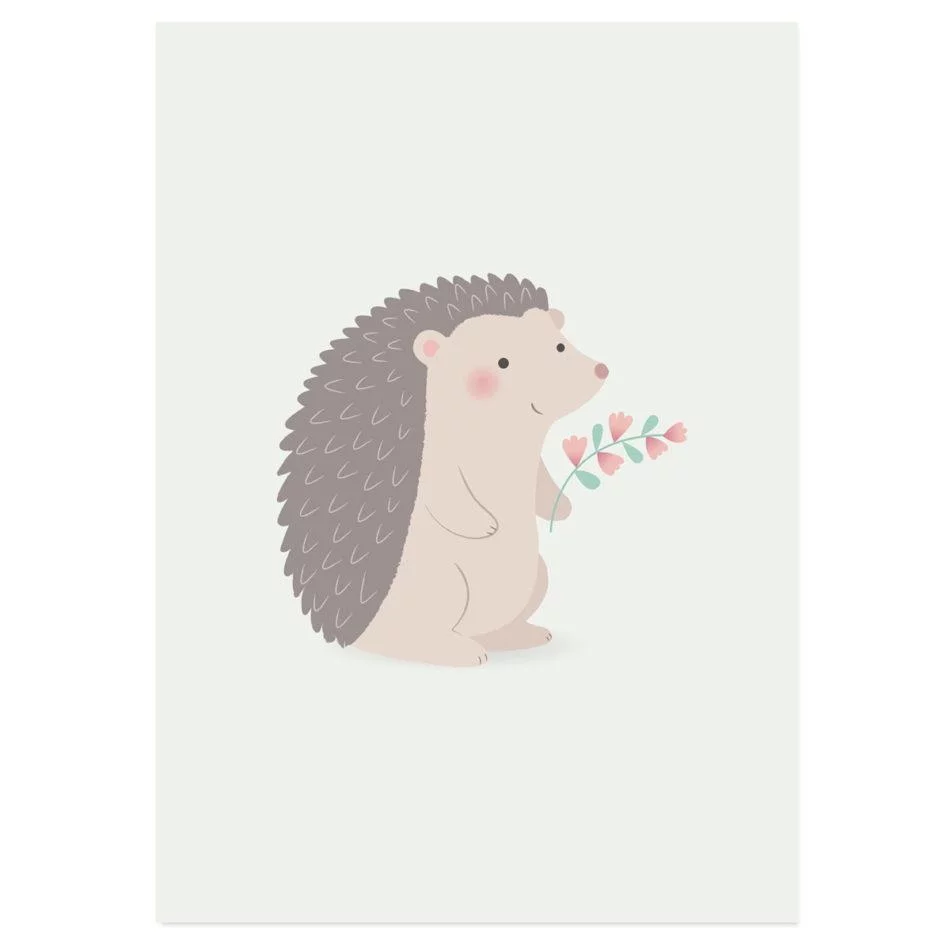 • Jolie affiche décorative illustrée d’un tendre hérisson tenant une petite fleur.