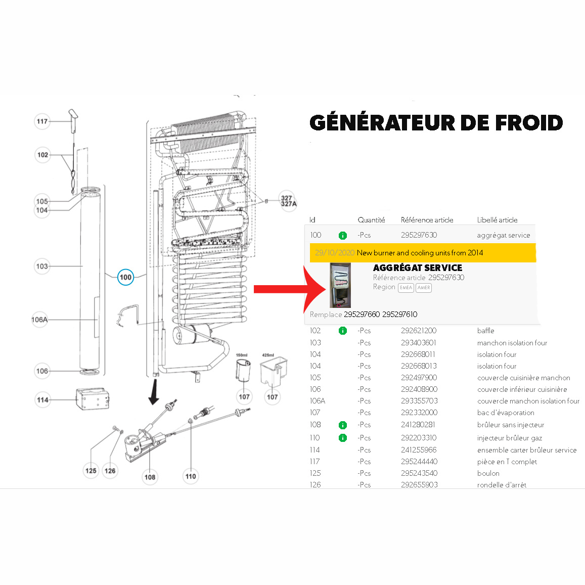 Pour vérifier si votre appareils comporte bien cet agrégat, merci de nous contacter tel 01.84.20.86.07 et munissez vous pour vérifier la compatibilité de votre numéro de produit de votre appareil Dometic (qui se trouve sur l’étiquette signalétique de votre réfrigérateur, que vous retrouverez à l’intérieur de votre réfrigérateur Dometic).
