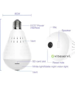 L’ampoule à caméra sans fil possède un angle de vision large de l’objectif à 360 degrés, objectif haute résolution 1080P, HD sans zone aveugle, prenant en charge 5 modes de visualisations. Cette caméra lumineuse wi-fi envoie des alertes de notification à votre smartphone lorsqu’un mouvement est détecté afin que vous sachiez immédiatement ce qui se passe. Vous pouvez également lire des clips vidéo d’alerte de mouvement pour vérifier les moments manqués. Cette caméra peut être directement installée au plafond de la maison. Compatibilité: Téléphone, IOS/Android, PC windows. La sécurité de l’ampoule prend en charge la carte micro SD jusqu’à 128G et l’option d’enregistrement vidéo en boucle, au-delà de la surveillance normale des ampoules de vision nocturne, avec LED blanches et lumières de vision nocturne. Ainsi, vous ne perdrez jamais un instant de capture vidéo de surveillance de qualité HD.