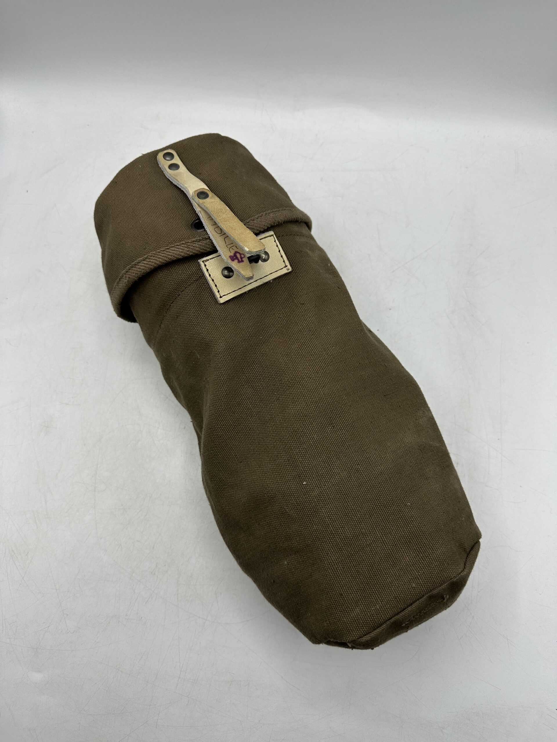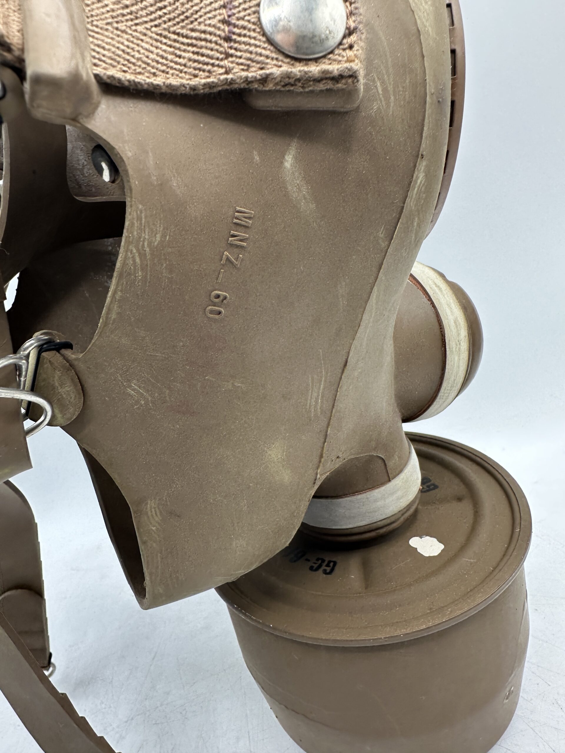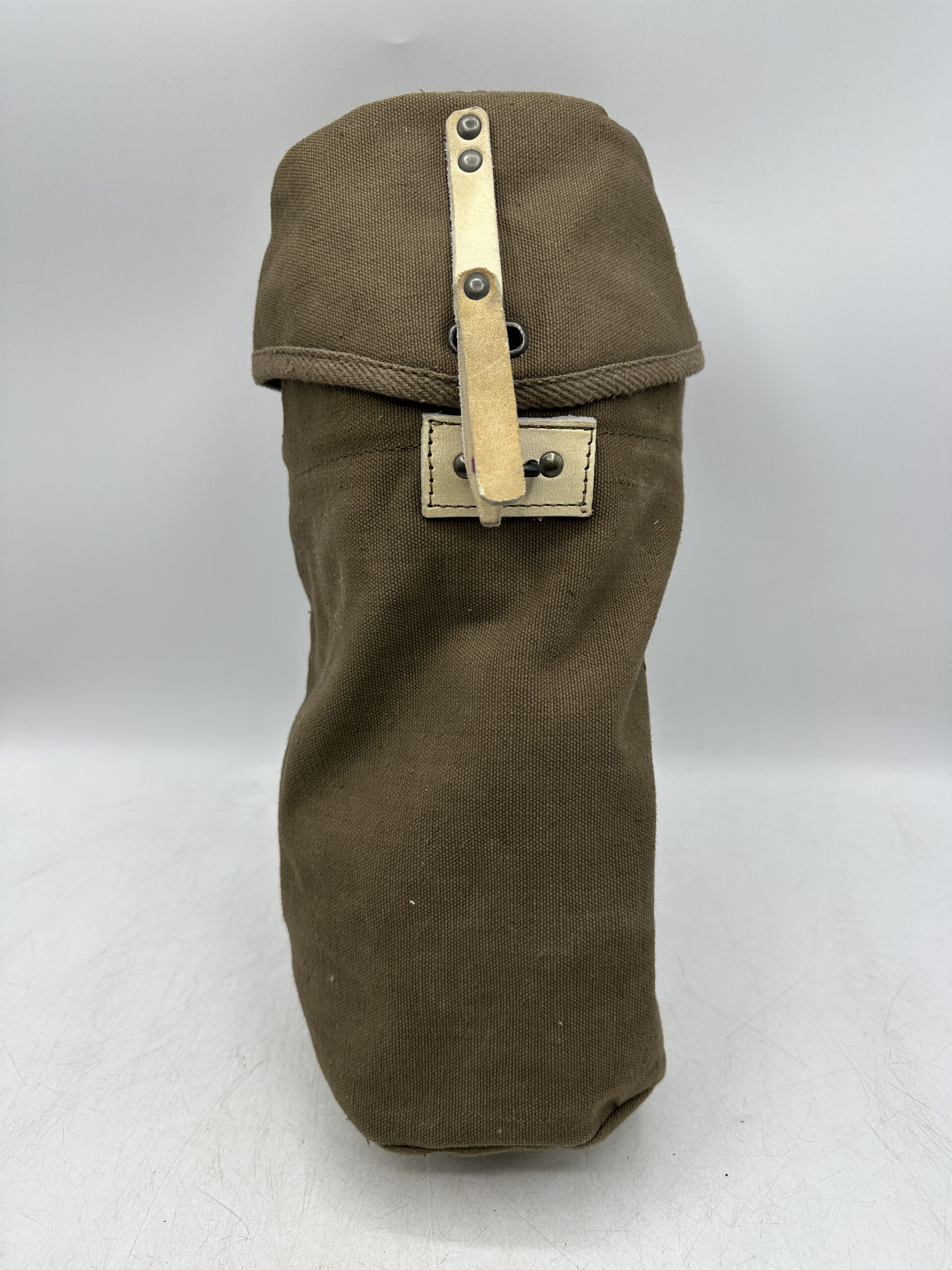 Cet ancien masque à gaz est estimé vers les années 1960. Il est en très bon état et complet avec son étui en tissu, sa cartouche, sa lanière et un verre de rechange.