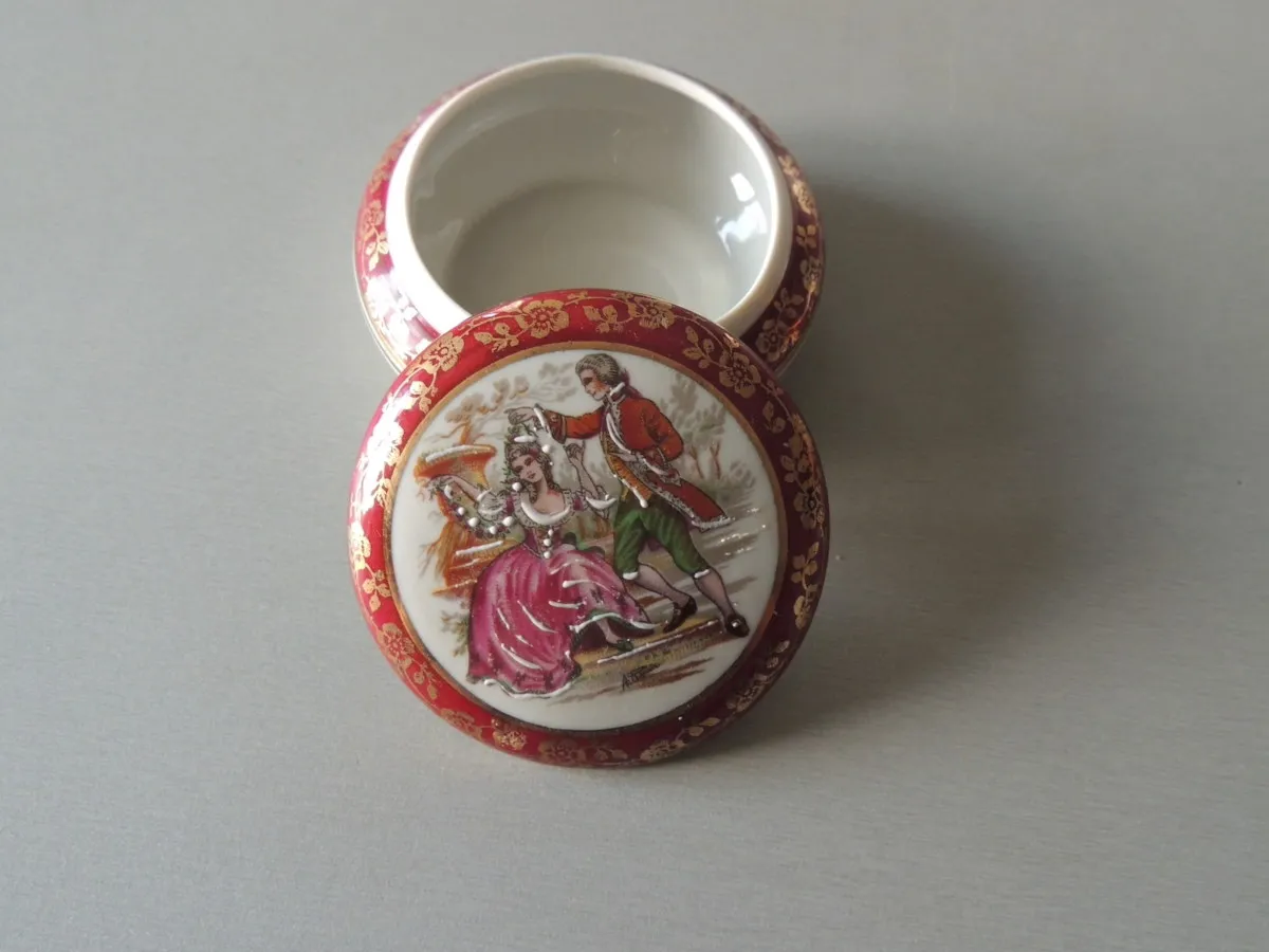 Boite à bijoux e porcelaine peinte à la main aux motif homme qui fait la cour, romance JO.BARY, Fragonard.