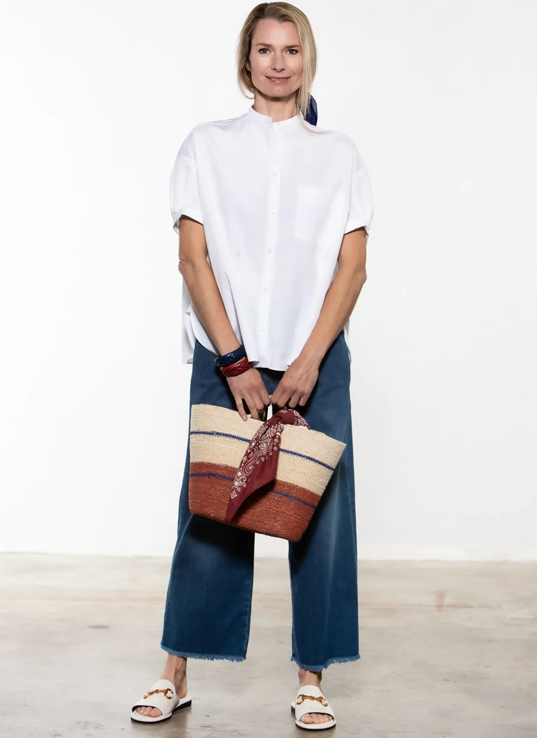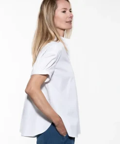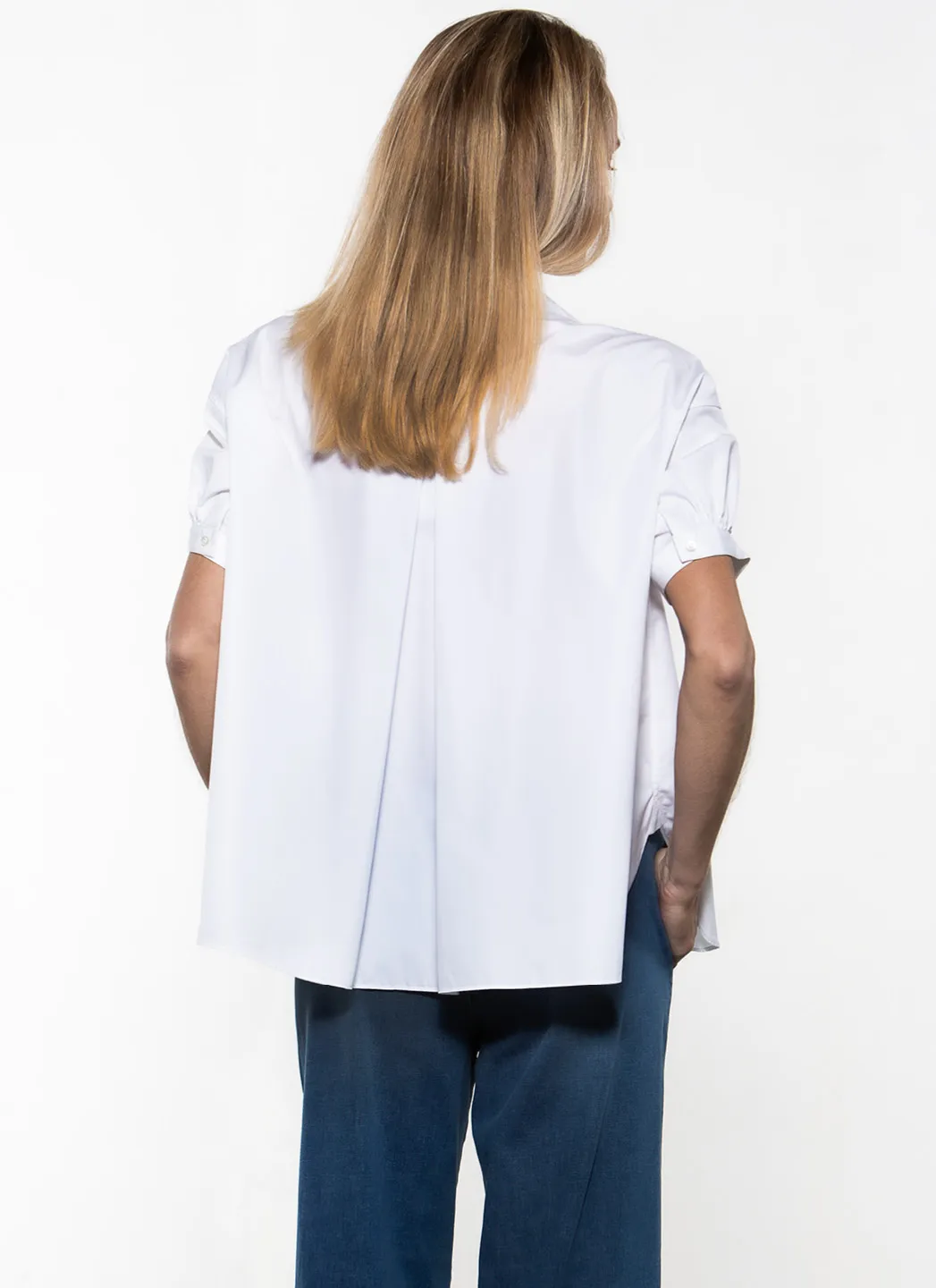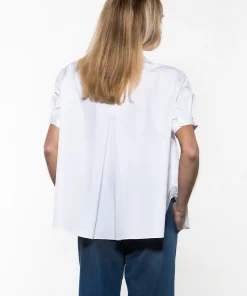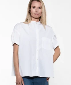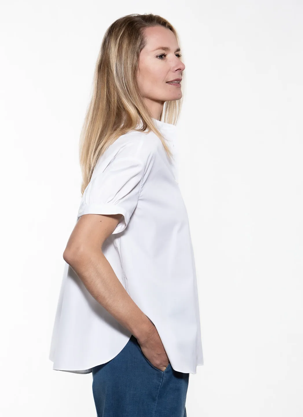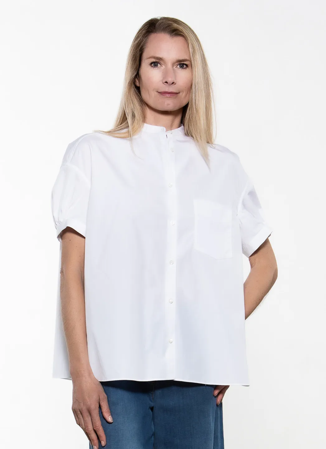 Chemise en pure popeline de coton. Le modèle présente un élégant col mao, un ourlet arrondi, une petite poche plaquée sur la poitrine et des manches courtes froncées avec ourlet. Coupe ample.