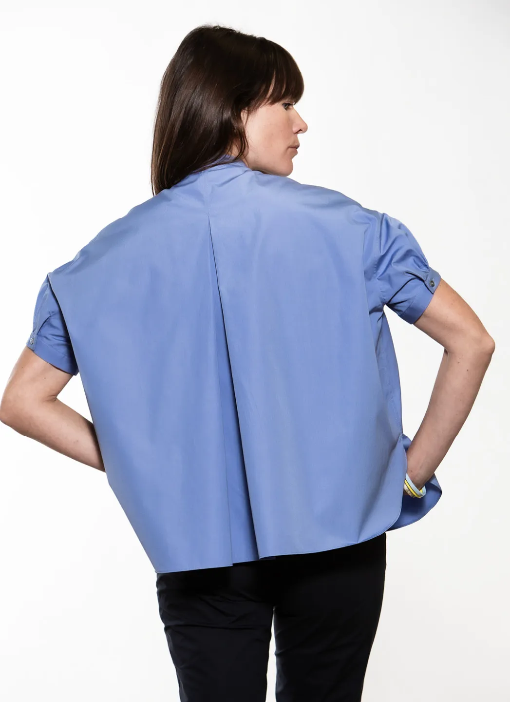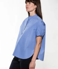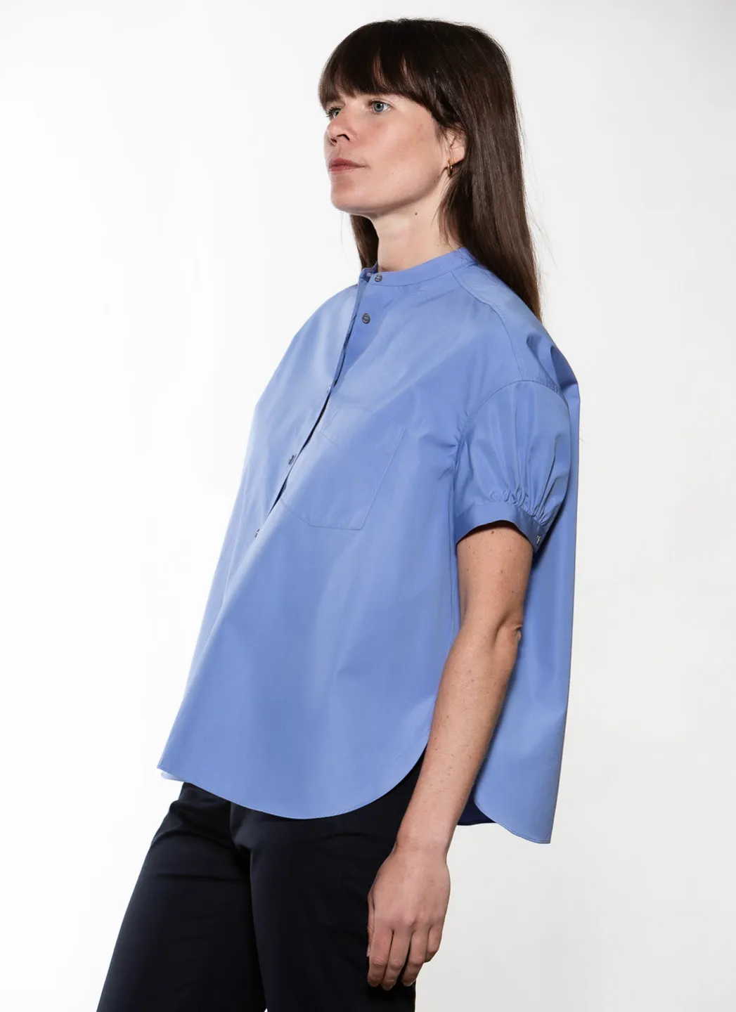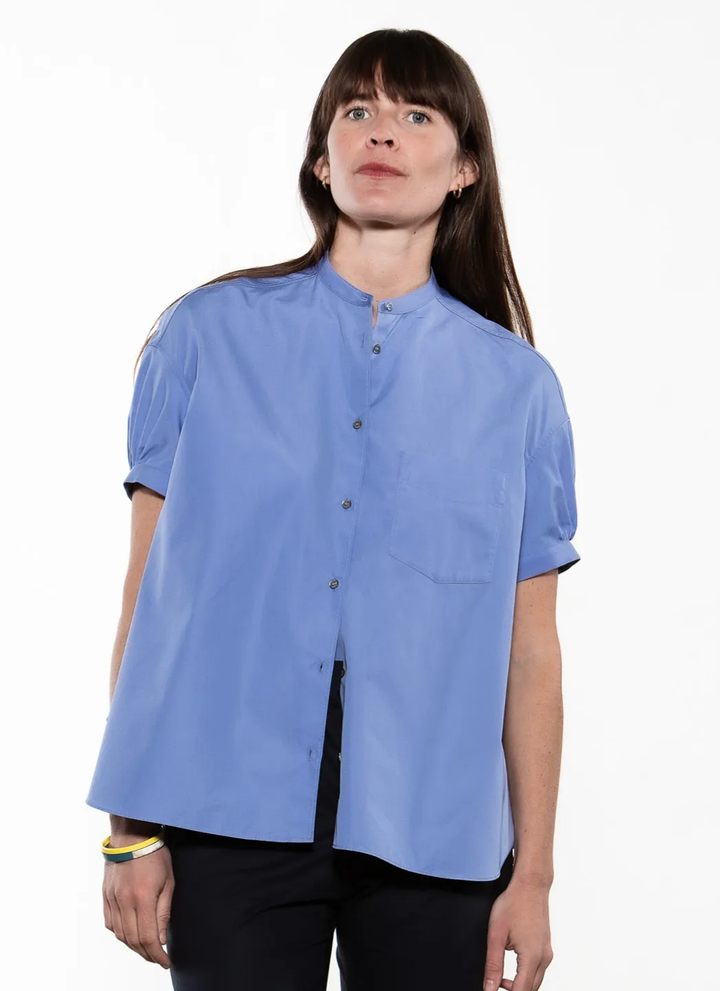 Chemise en pure popeline de coton. Le modèle présente un élégant col mao, un ourlet arrondi, une petite poche plaquée sur la poitrine et des manches courtes froncées avec ourlet. Coupe ample.