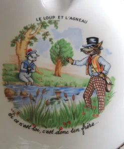 Assiette à bouillie motif les fable de la fontaine » le loup et l’agneau ». En porcelaine.