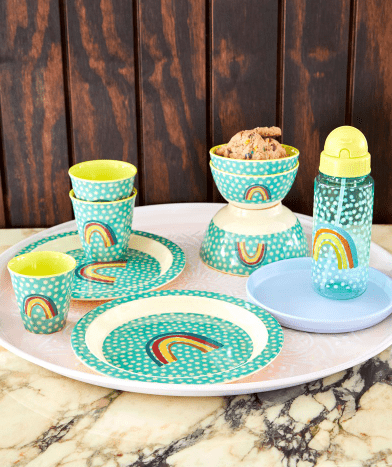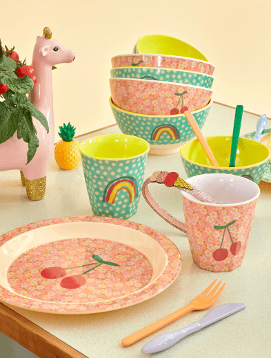 La mélamine est un matériau solide, réutilisable et exempt de BPA et de tout autre substance nocive. Une alternative durable à la vaisselle en carton ou en plastique.