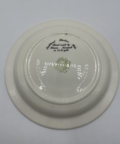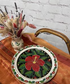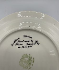 Cette sublime assiette de collection est estampillée Ceramica Olympia et elle a entièrement été réalisée à la main ce qui en fit un objet unique. D’origine grecque, cette assiette est en réalité une assiette traditionnelle de la ville de Rhodes. Elle est décorée du motif Hibiscus qui représente une grosse fleur d’hibiscus en son centre sur fond noir et décorée avec une frise de feuilles de couleur rouge verte et jaune avec des liserés dorés de 24 carats d’or. Vintage, des traces d’usure sont à prévoir (cf photos) jolies marques du temps passé. Une sublime assiette à collectionner !