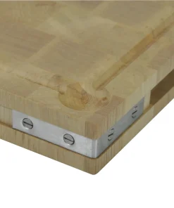 Planche à découper en bois de charme du Jura. Dimensions 50 x 40 cm. Épaisseur de 5 cm. Équerres en inox. Rigole ramasse jus pour les viandes cuites.