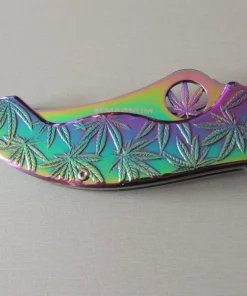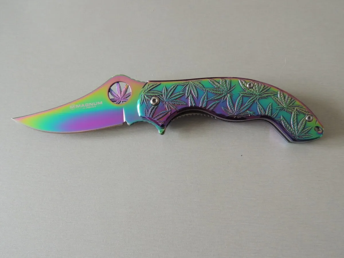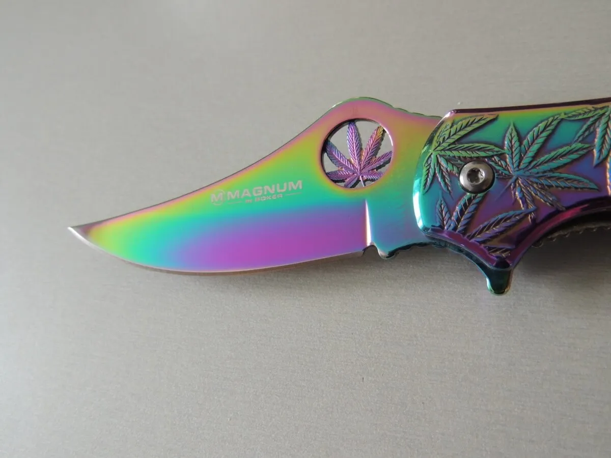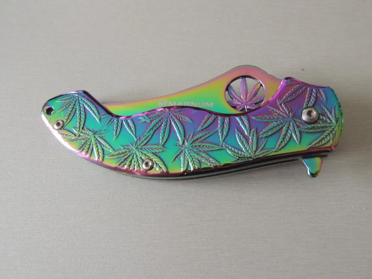 Le Magnum Colorado Rainbow est un couteau de poche pratique et robuste avec le revêtement de couleur arc-en-ciel populaire. C’est le couteau parfait pour tous les botanistes amateurs et amis de la plante utile extrêmement polyvalente de la famille du chanvre. La poignée robuste en acier inoxydable est décorée des feuilles caractéristiques de l’herbe légalement disponible dans le Colorado et de plus en plus d’autres États des États-Unis. Avec trou de lanière pratique et clip.