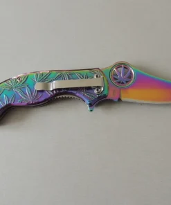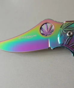 Couteaux de poche Bocker Magnum Colorado Rainbow, manche décor feuille de canabis arc en ciel, lame acier inoxydable 440A peut être ouverte d’une seule main et se verrouille avec un linerlock.