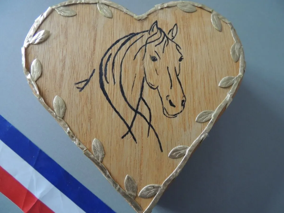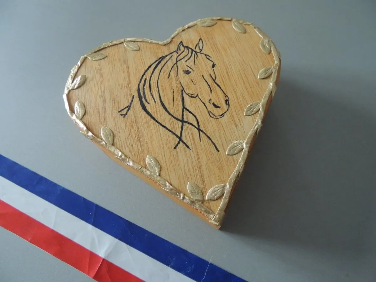 Teintée chêne moyen le cheval est dessinée sur son couvercle. Les contours du cœur sont orné d’un liséré feuillu couleur or.