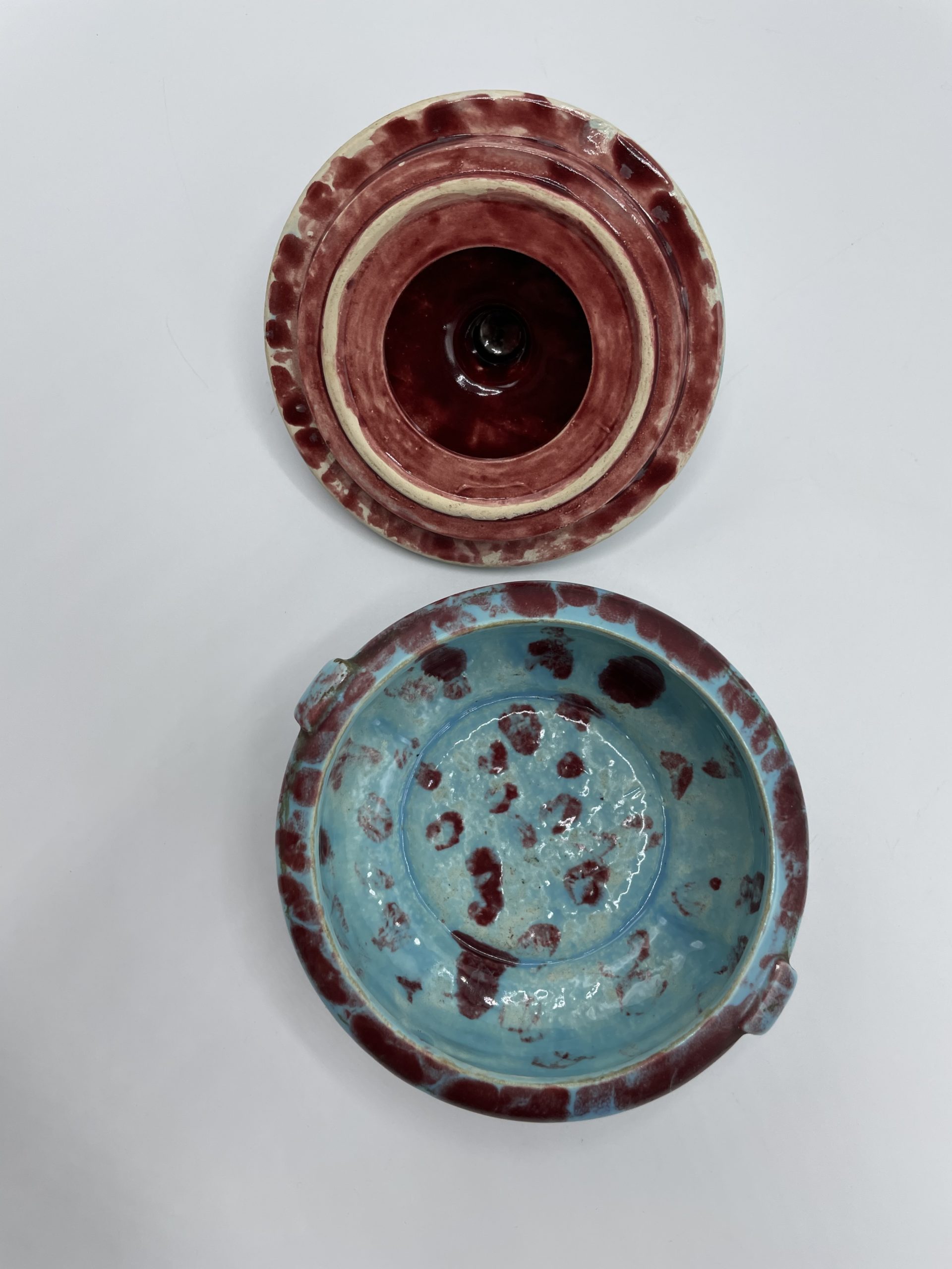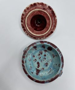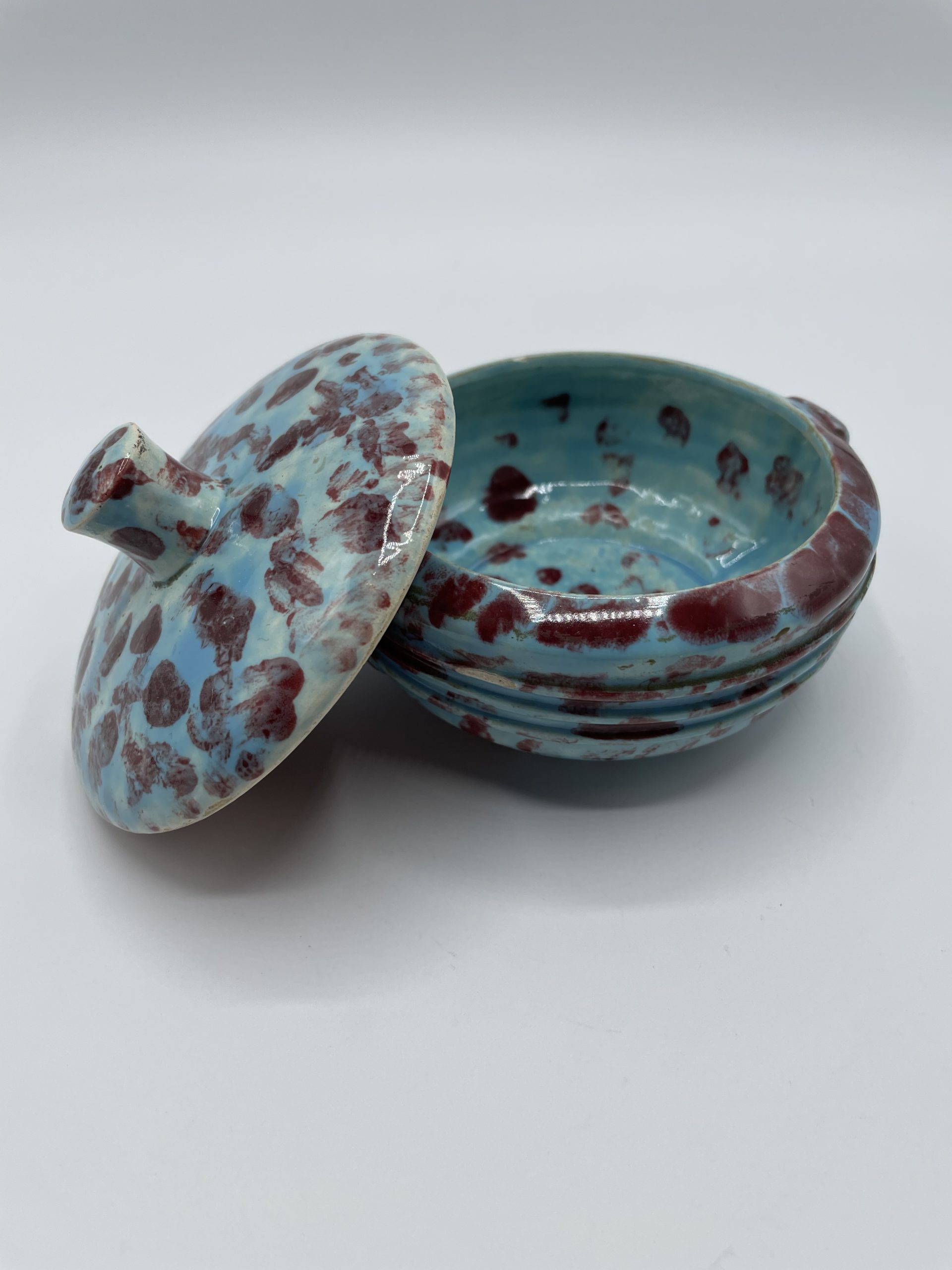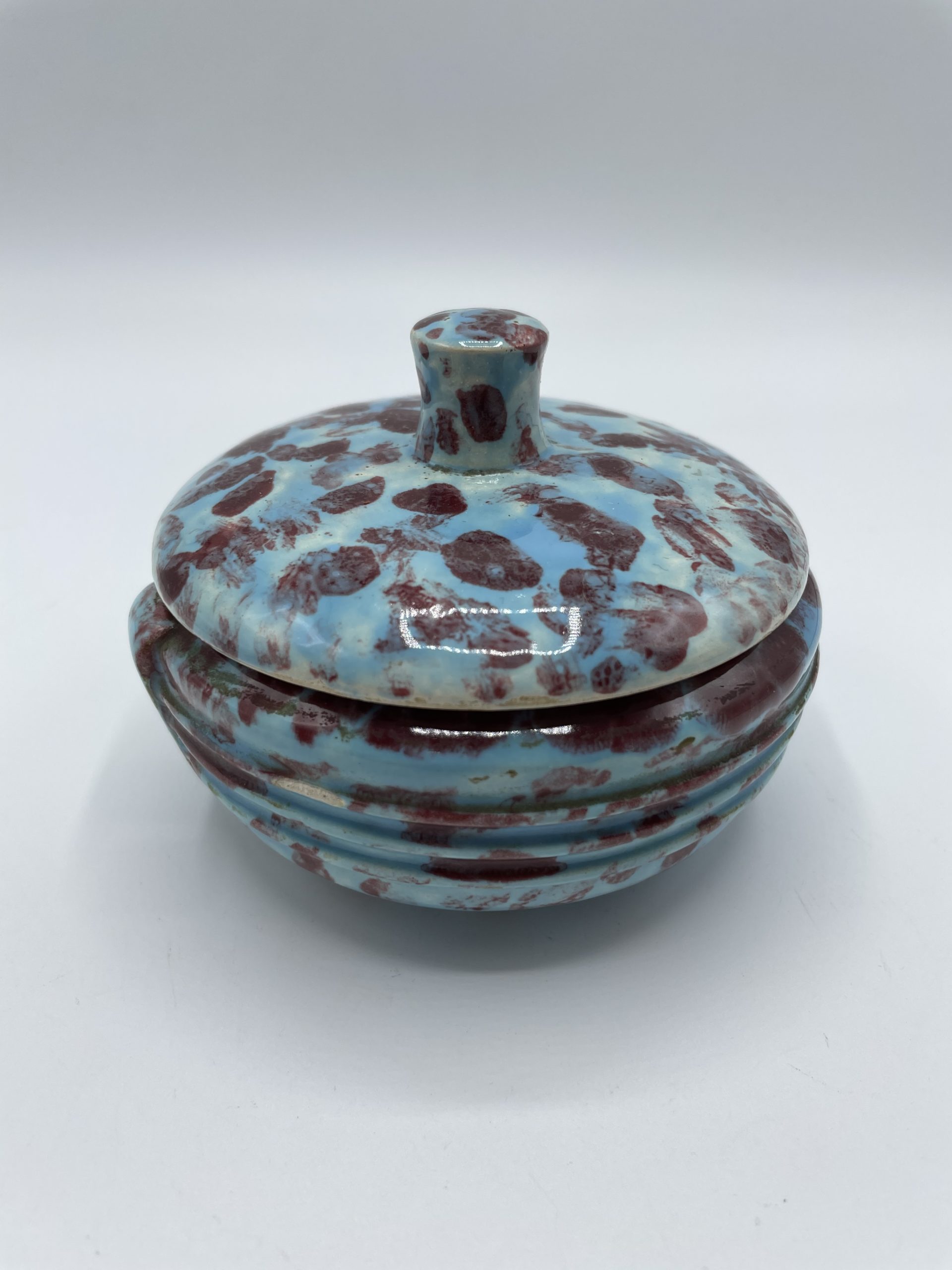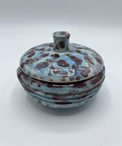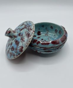Joli petit écrin en faïence de couleur bleu turquoise tacheté de bordeaux. Avec sa taille pratique, cette petite bonbonnière peut se transformer en écrin à bijou, à poudre ou encore en récipient pour y ranger vos épices.