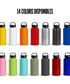 La bouteille est disponible en une variété de couleurs vibrantes, incluant noir granité, aluminium, jaune, orange, rose, vert, turquoise, kaki, rouge métallisé, et reflex métallisé, permettant de s’adapter à tous les goûts et préférences. La personnalisation de la bouteille se fait par sérigraphie circulaire en une couleur, couvrant toute la surface. Cela permet d’afficher de manière visible et esthétique un logo, un message ou tout autre design, faisant de cette bouteille un support publicitaire efficace pour les entreprises souhaitant promouvoir leur image de marque de manière écologique. La grande zone de marquage offre une flexibilité créative pour maximiser l’impact visuel.