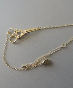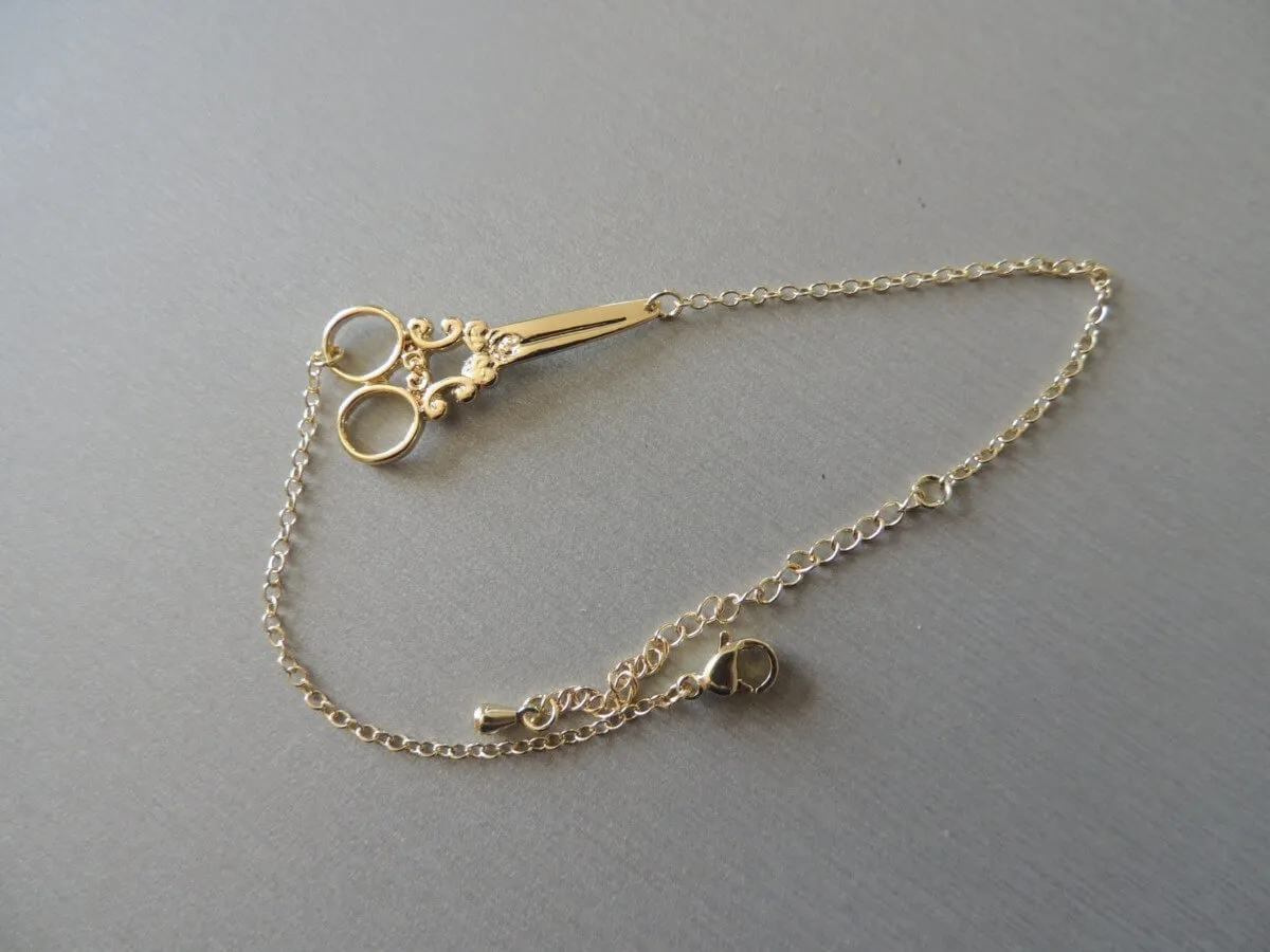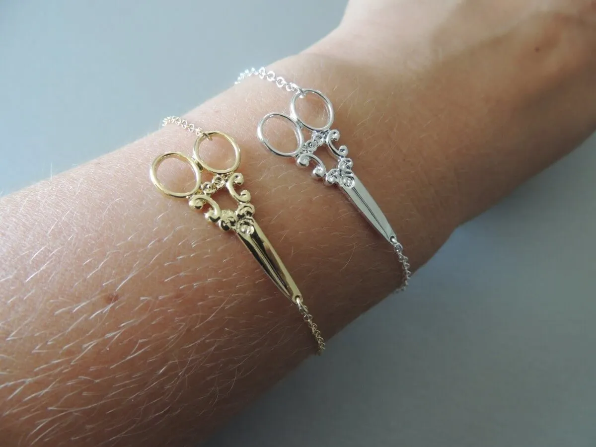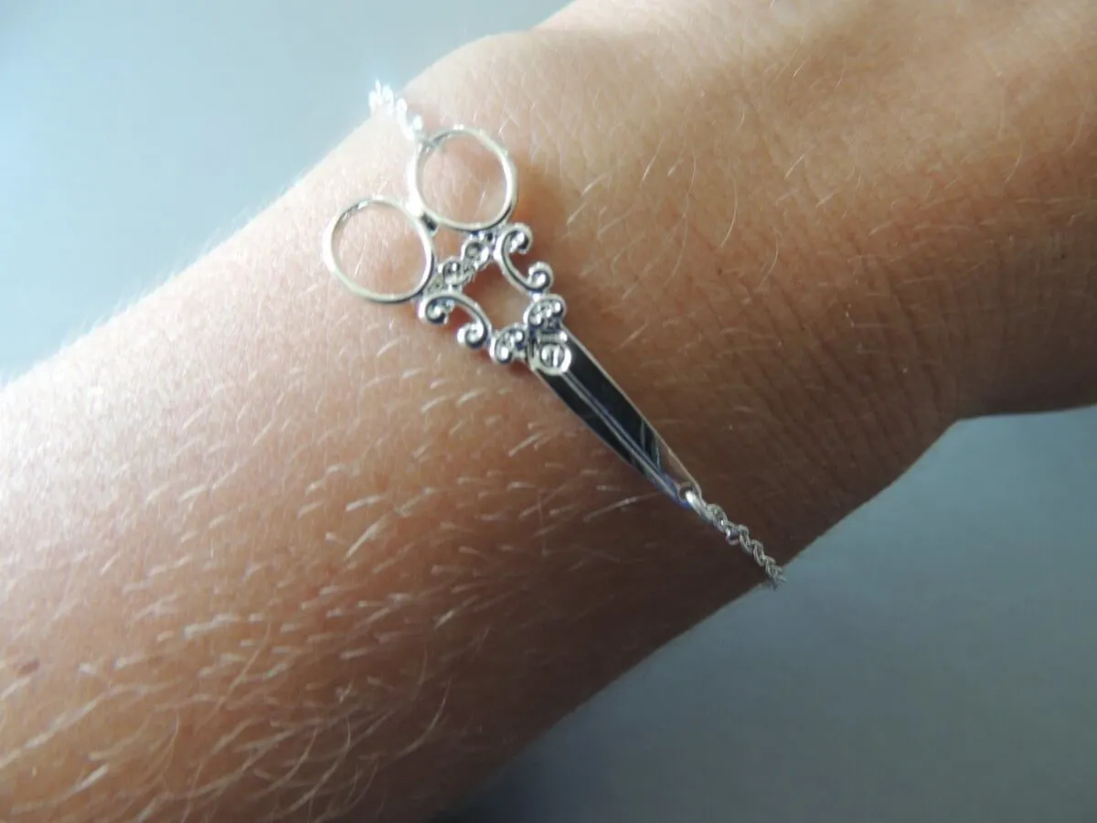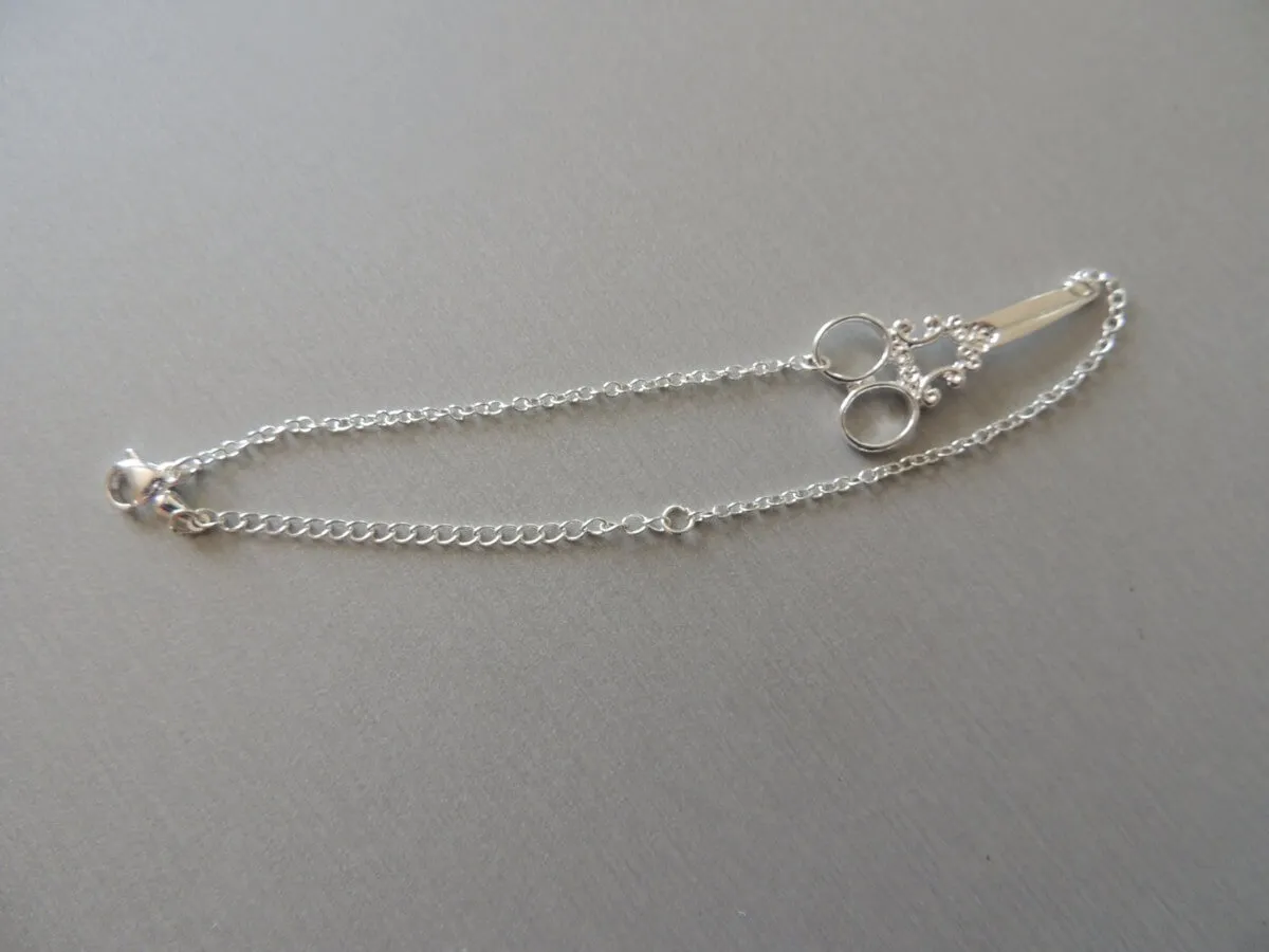 Bracelet ciseaux, fermeture à attache avec chainette permétant une marge réglage pour la taille.