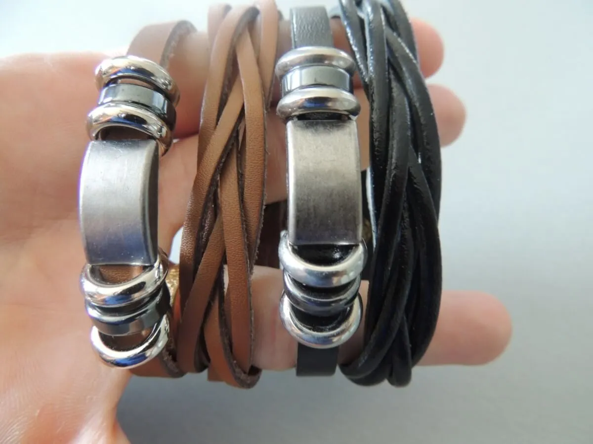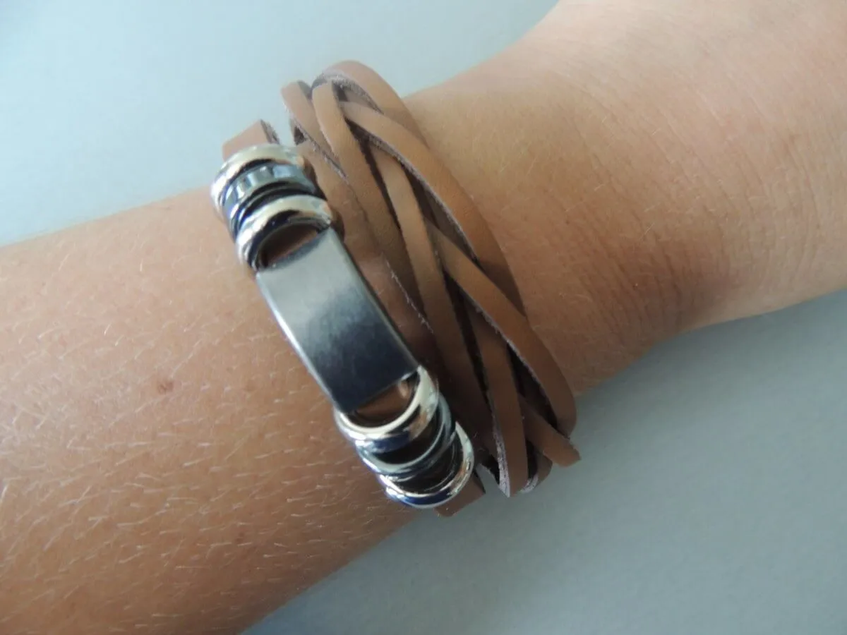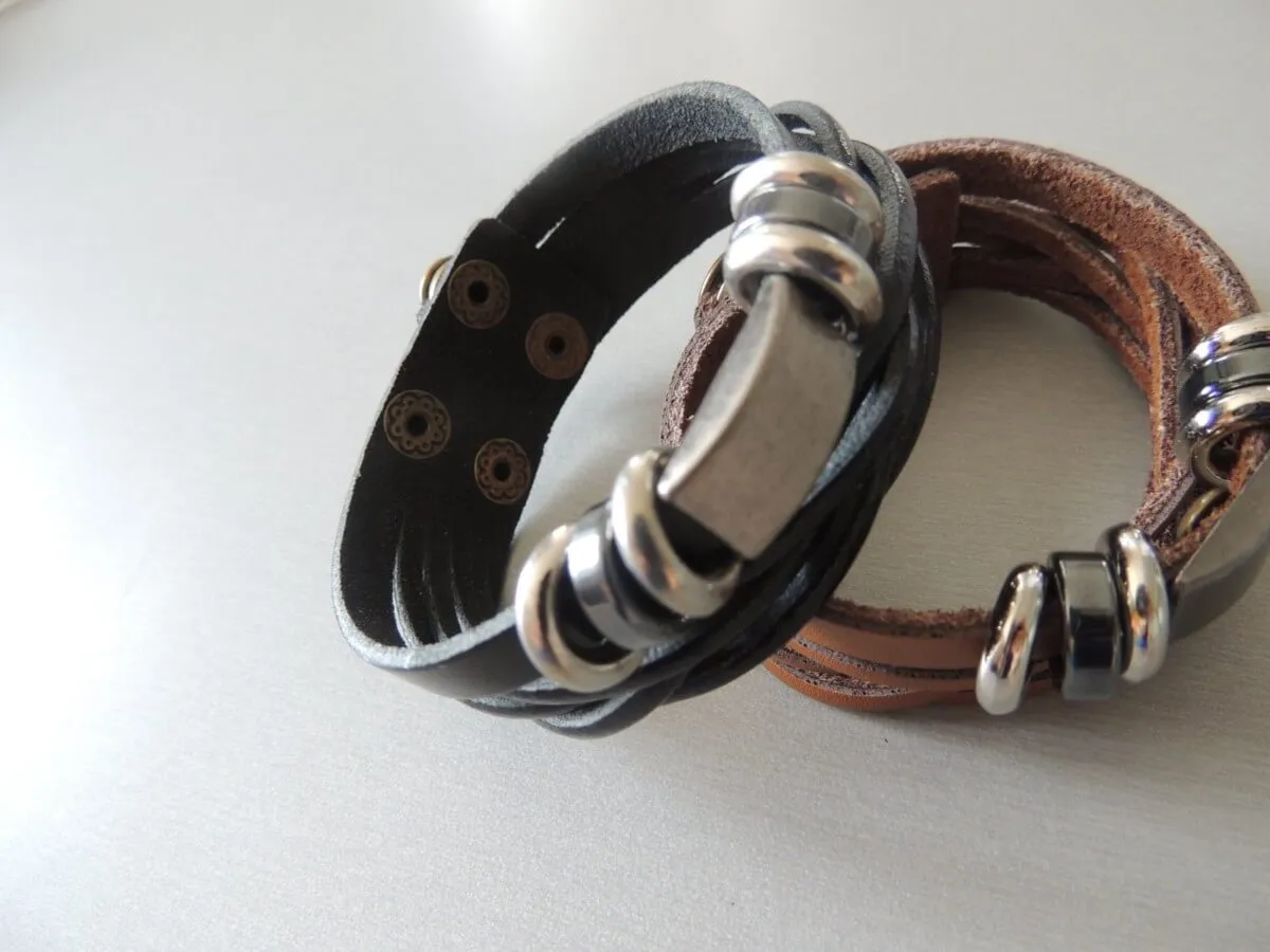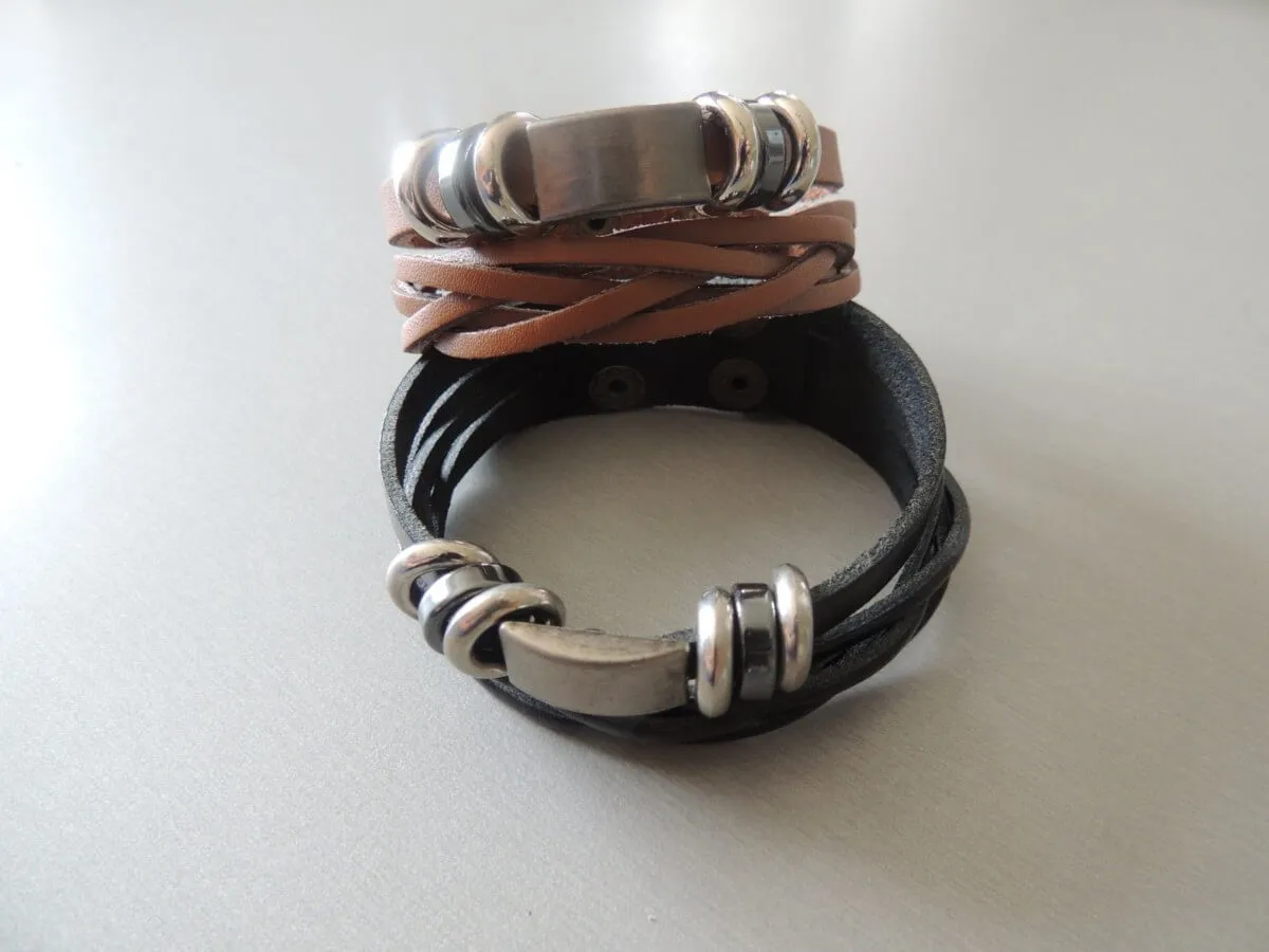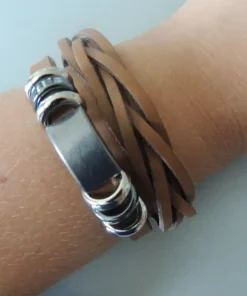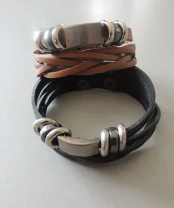 Bracelet en cuir,double tressé et assemeblé en breloque nickelé, fermeture à double pression permétant une marge de taille.