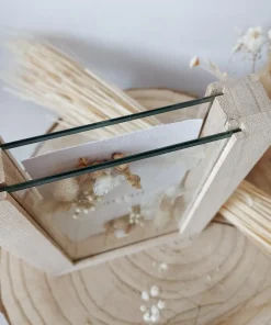 Petit cadre en bois naturel brut décoré de fleurs séchées et hortensia stabilisé. Il est original par son ouverture sur le dessus, très joli à poser dans une décoration scandinave, moderne ou naturelle.