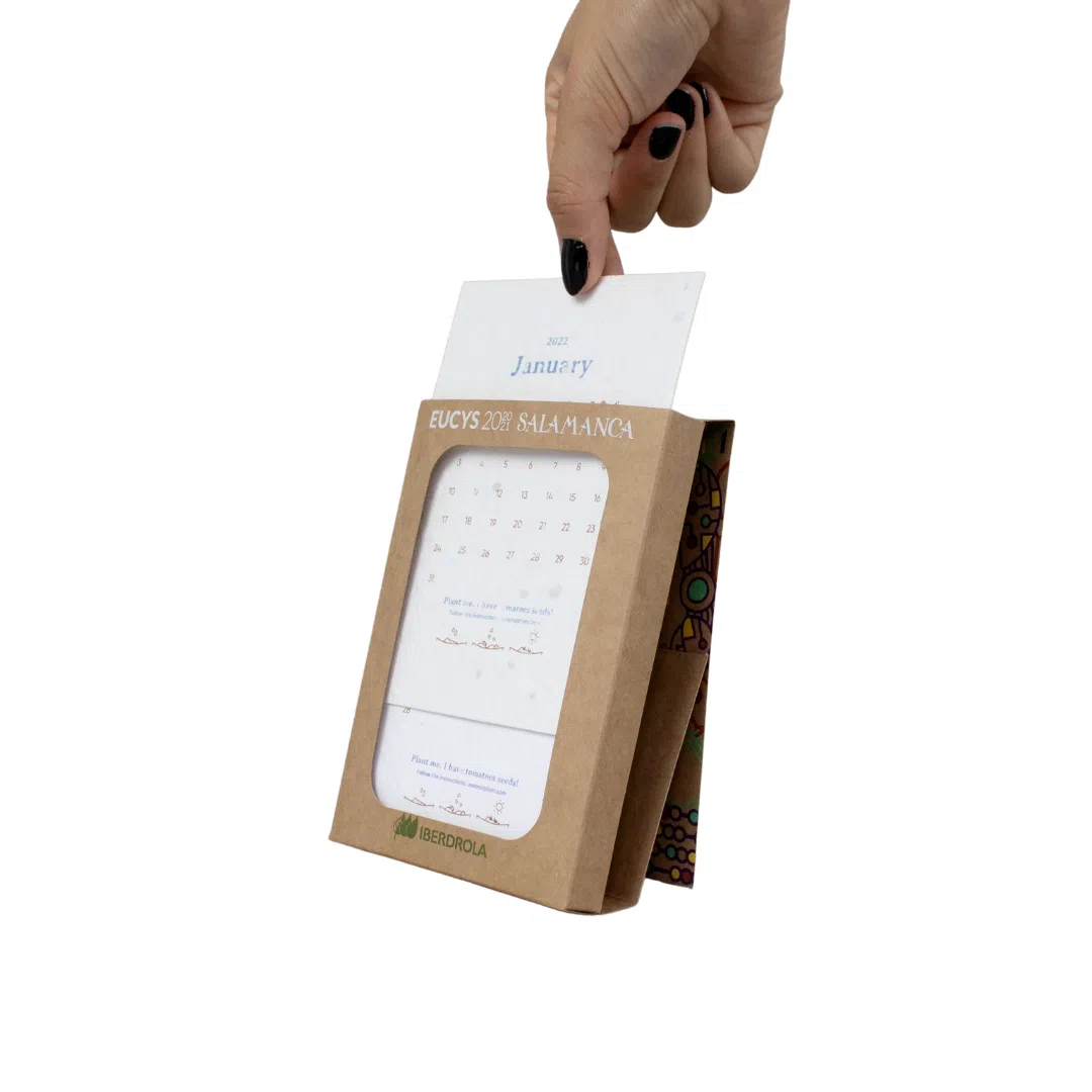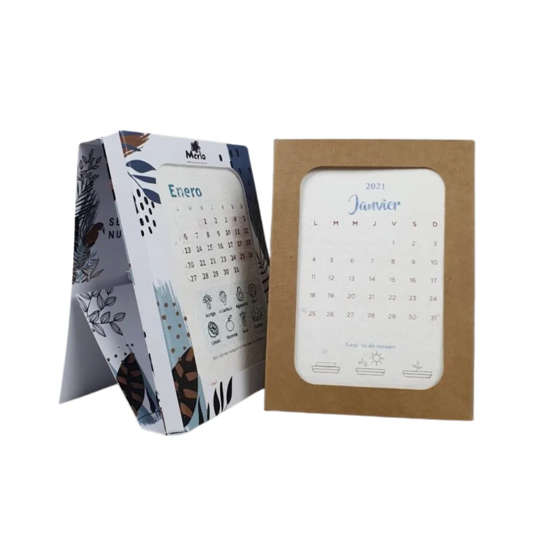 Offrez à vos collaborateurs et clients un calendrier en papier FSC et graines qui ne succombe pas aux saisons. Un cadeau pratique pour le quotidien et ne présentant pas de menaces pour l’environnement. ?