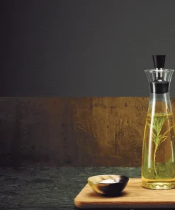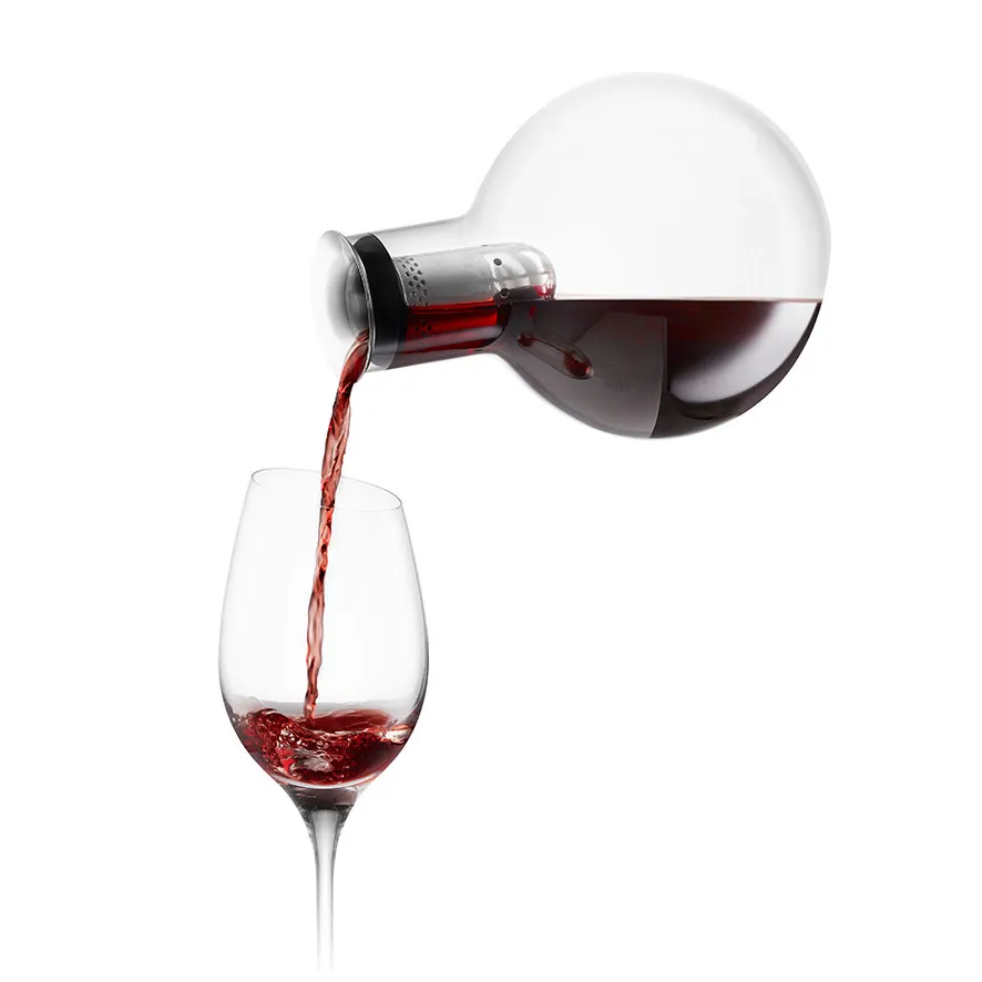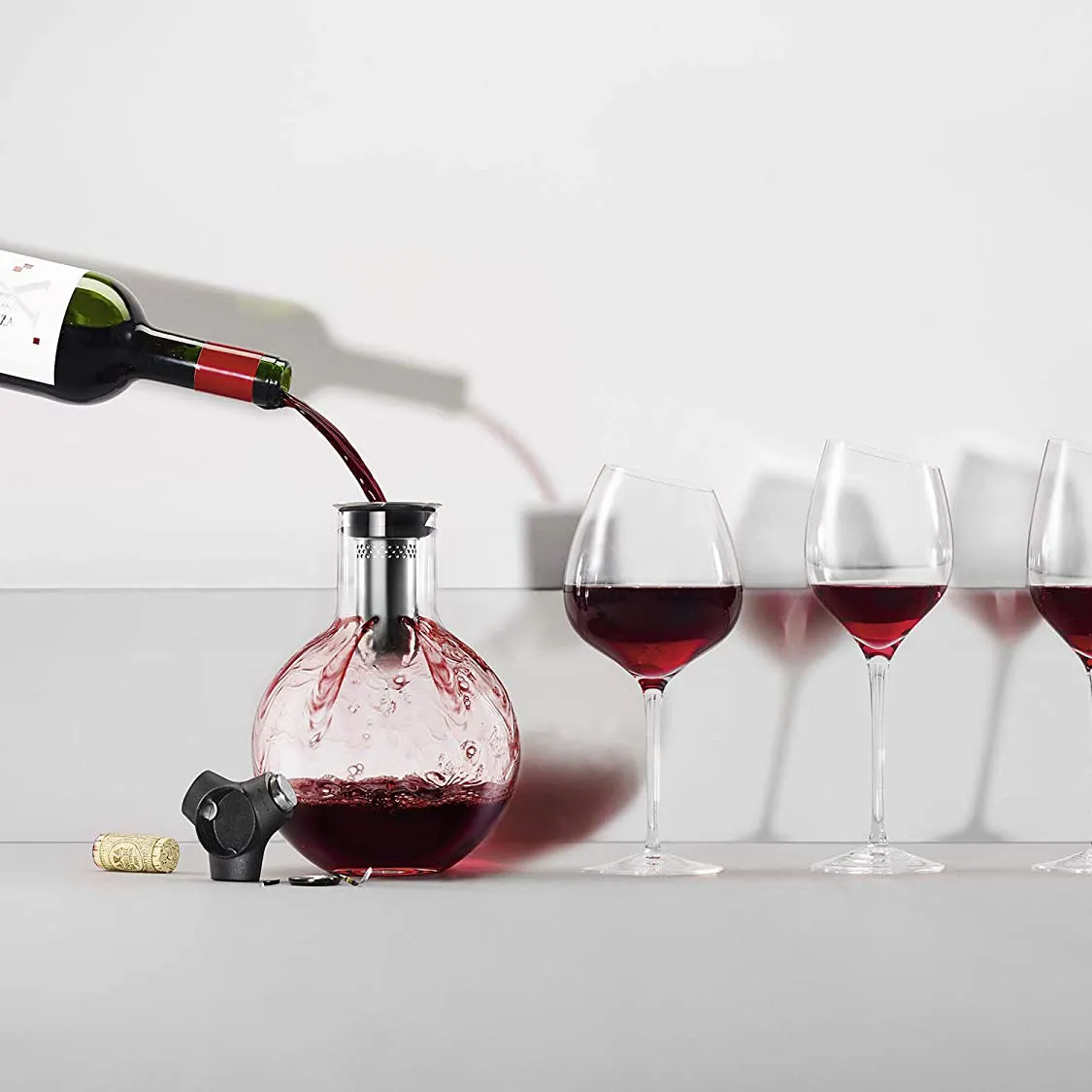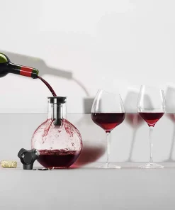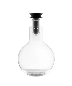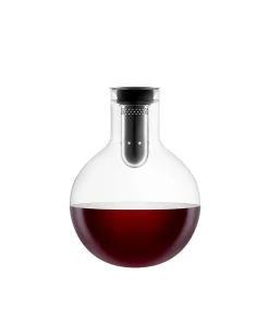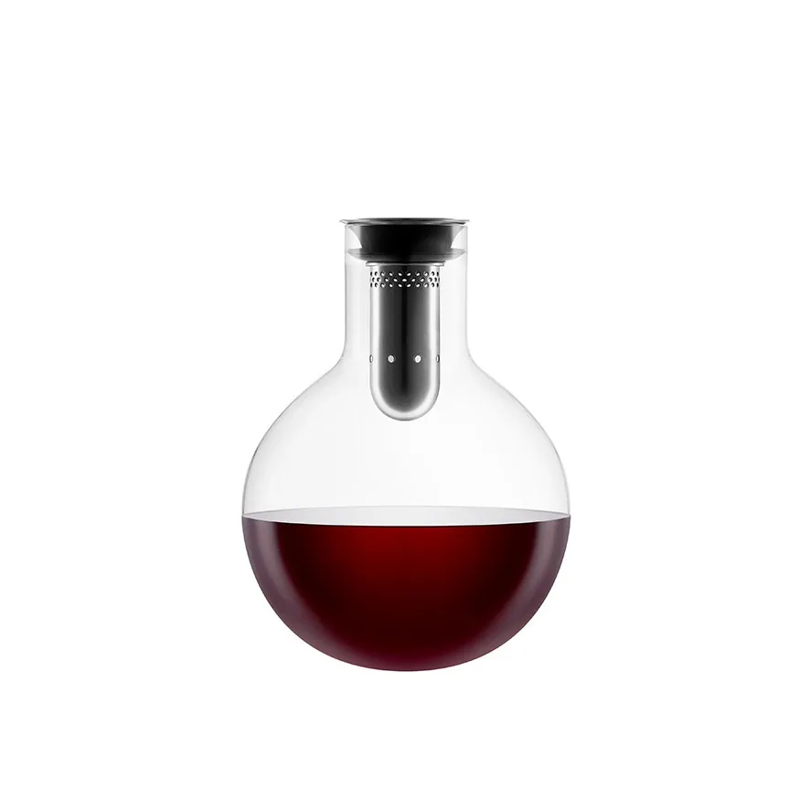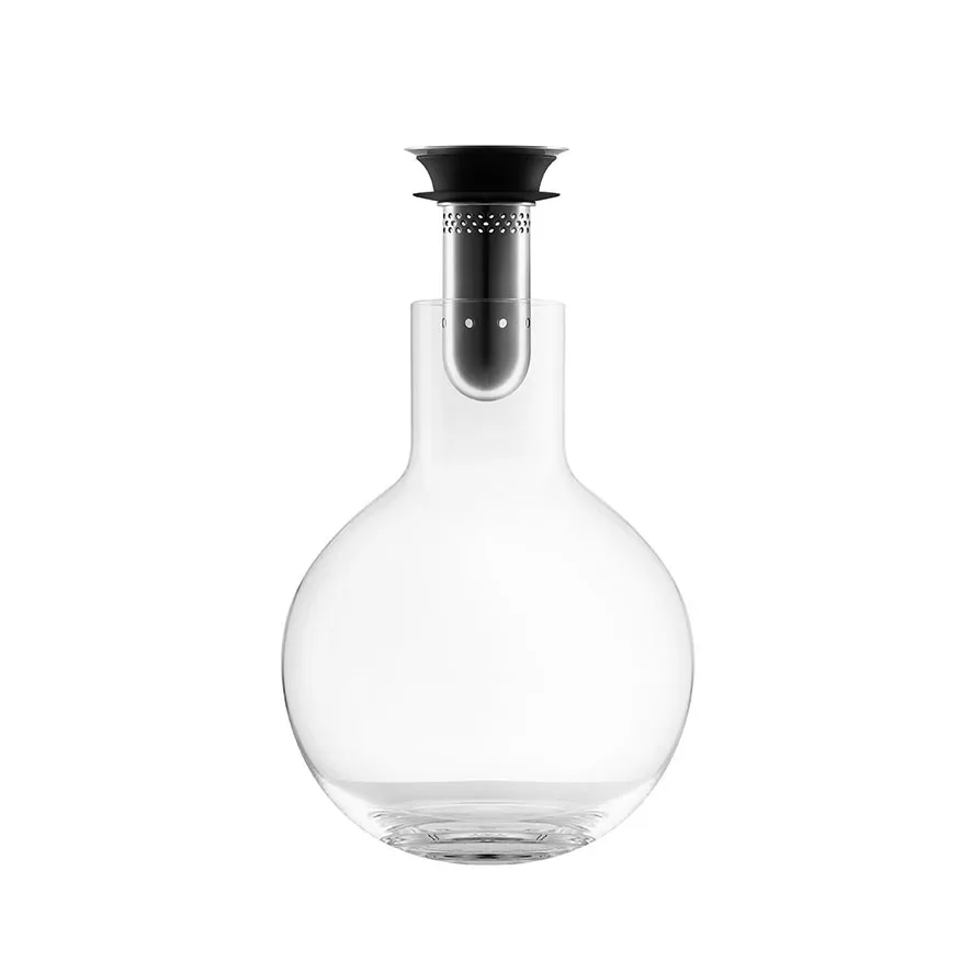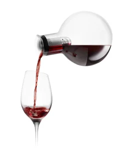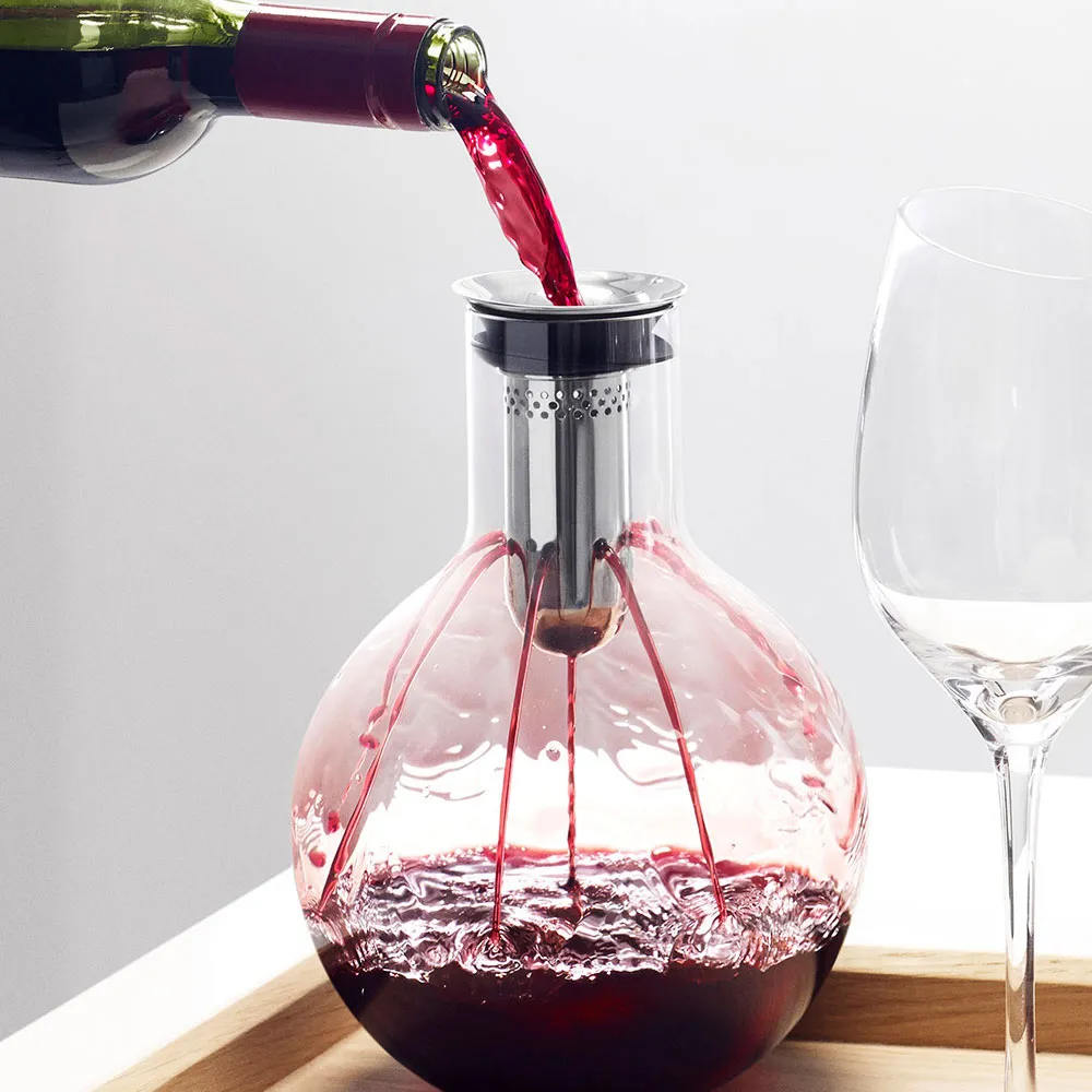 La carafe à décanter fait ressortir les arômes du vin. Lorsque le vin est versé dans la carafe, il s’écoule par de petits trous dans l’entonnoir intégré et glisse le long des parois intérieures de la carafe. Cela permet d’oxygéner le vin en douceur, efficacement – et d’une façon esthétique. De plus, la grande surface de la carafe aide le vin à s’aérer :