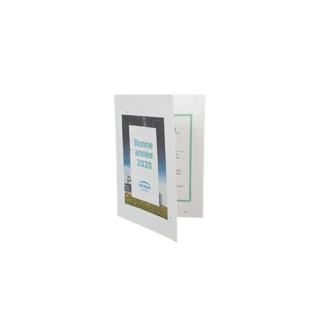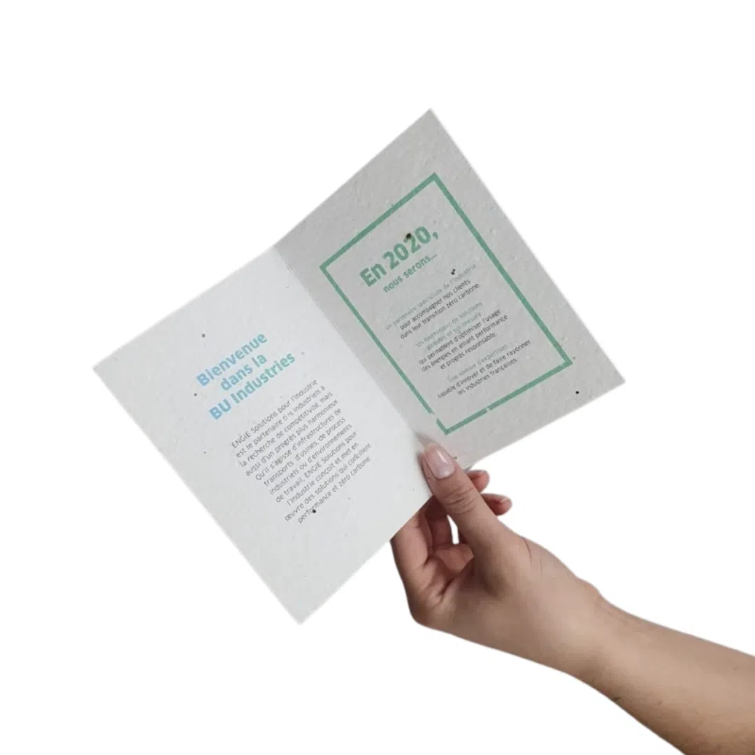 Carte pliante à planter. Dimensions fermée : 10,5 x 14,8 cm (A6), 14,8 x 21 cm (A5). Dimensions ouverte : 21 x 29,7 cm. Poids : 10 g. Personnalisation : impression numérique (quadri). Zone de marquage : recto/verso. Matière : 100% coton recyclé et graines. Grammage : 250 g/m². Graines : tomate, camomille, fleurs sauvages. Origine : Europe.