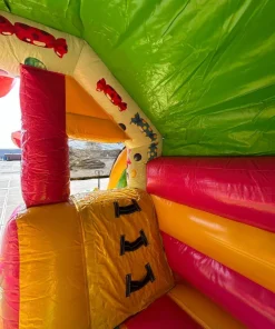 Ce chateau gonflable en location, d’une dimension de 4,7m sur 3,7m, peut être installé en intérieur comme en extérieur. Ce château gonflable couvert avec toboggan permettra à vos enfants de s’amuser en toute sécurité (ils pourront grimper et glisser sur le toboggan). Ce château gonflable à louer peut recevoir jusqu’à 5 personnes en même temps et se gonfle facilement. Il est fourni avec une soufflerie/gonfleur et une allonge de 20 mètres. Attention, il faut prévoir une arrivée électrique.
