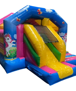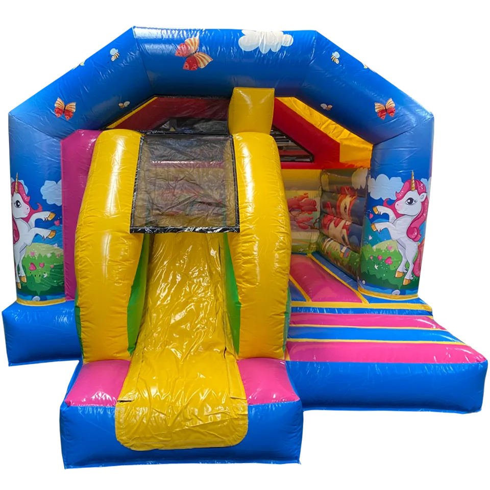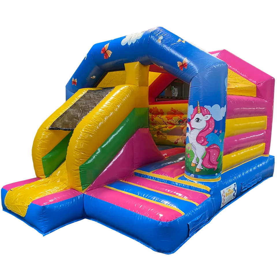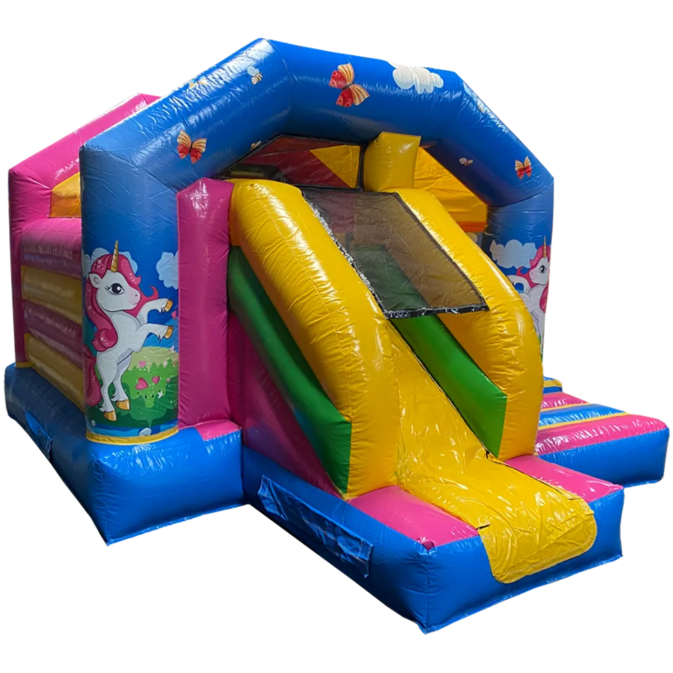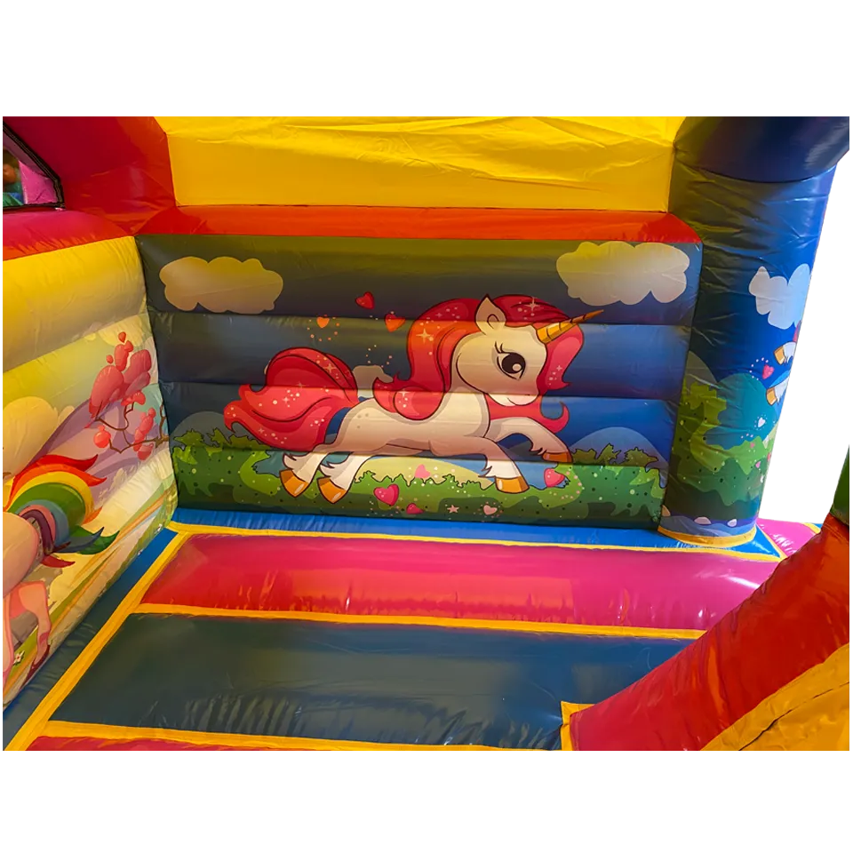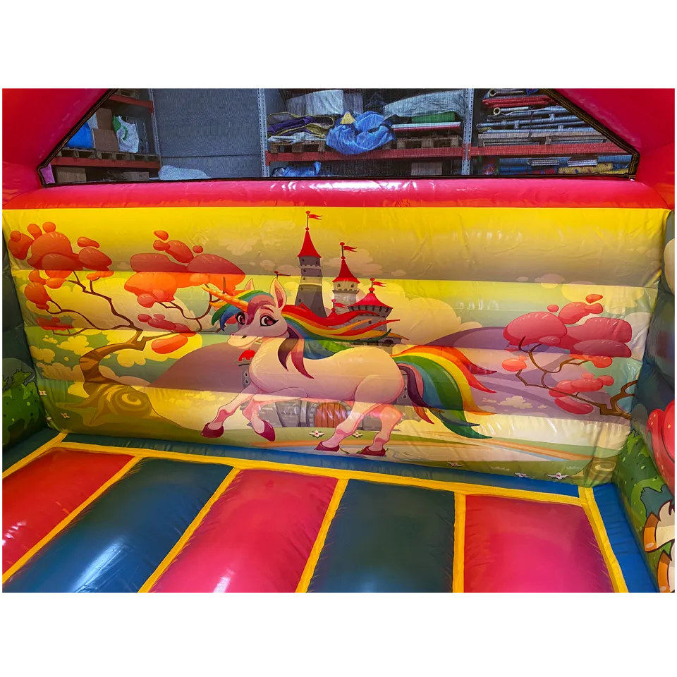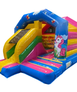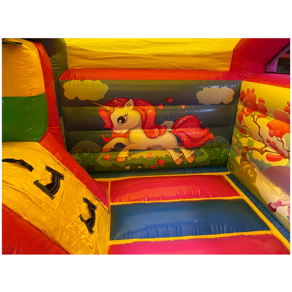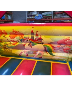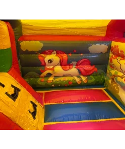 Ce chateau gonflable en location, d’une dimension de 4m sur 5m, peut être installé en intérieur comme en extérieur. Ce château gonflable géant avec toboggan Licorne permettra à vos enfants de s’amuser en toute sécurité (ils pourront grimper et glisser sur le toboggan latéral ). Ce château gonflable à louer peut recevoir jusqu’à 10 personnes en même temps et se gonfle facilement. Il est fourni avec une soufflerie/gonfleur et une allonge de 20 mètres. Attention, il faut prévoir une arrivée électrique.