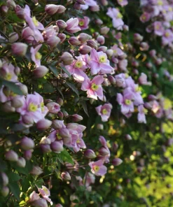 Dès le mois de mai, elle se couvre d’une impressionnante masse de fleurs de 3 à 4 cm de diamètre. Leur couleur rose tendre et leur agréable parfum en font une des stars du jardin ! Quand les fleurs disparaissent, leur feuillage vert bronze reste joliment ornemental. Celui-ci est caduc.