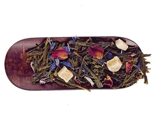 Thé vert fruité à la note d’ananas, morceaux d’ananas, pétales de bleuet, pétales de rose.