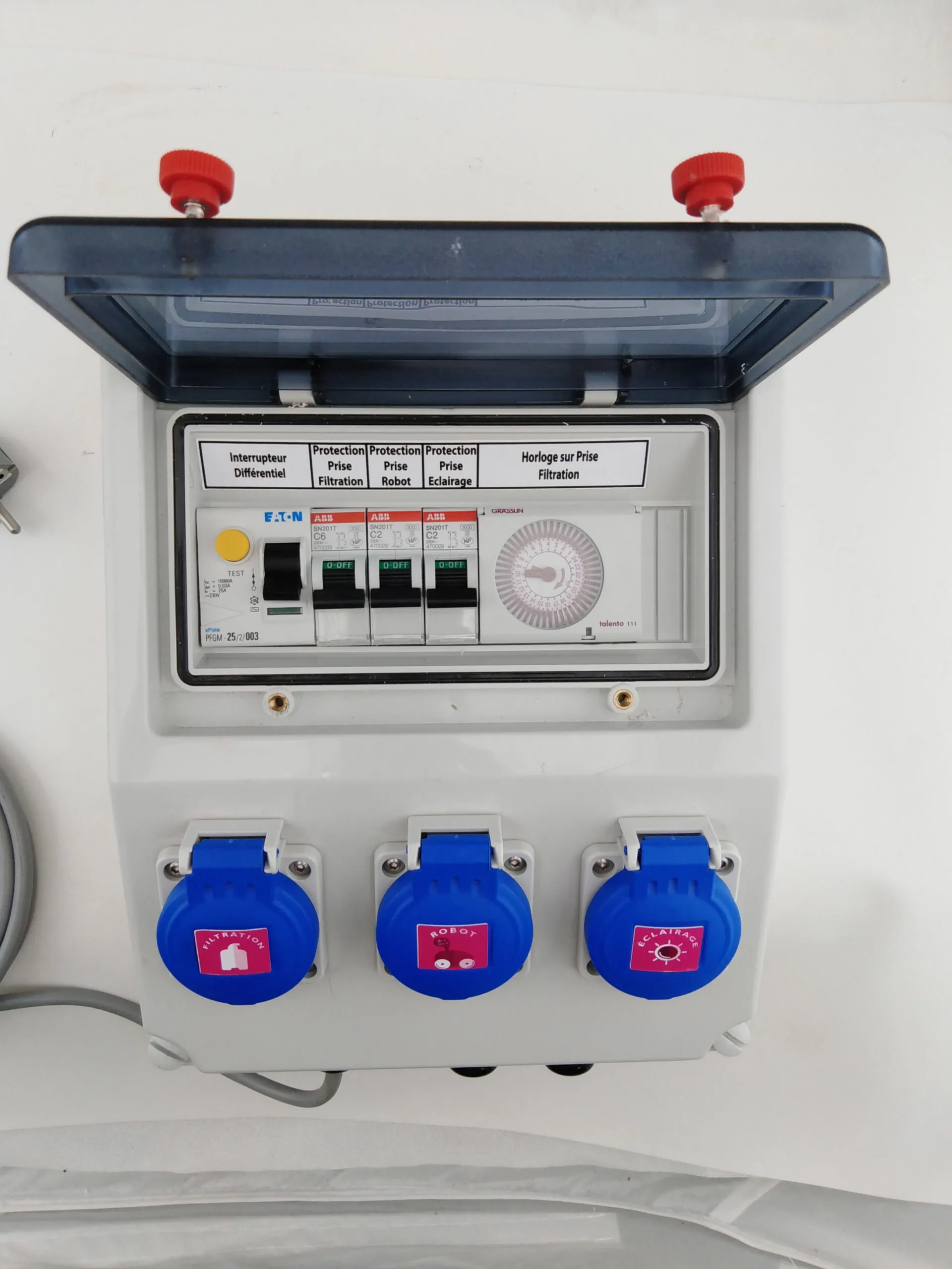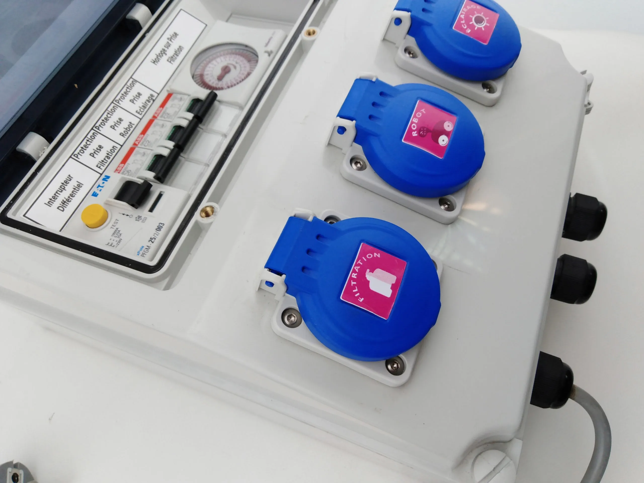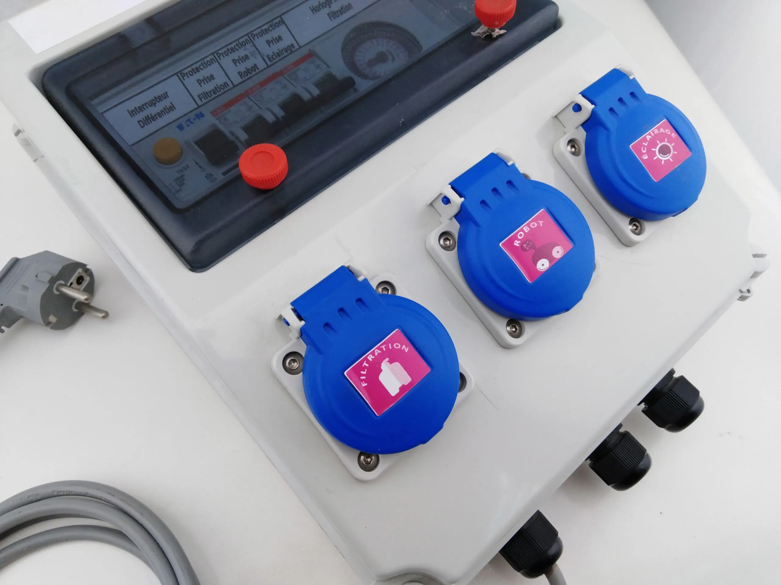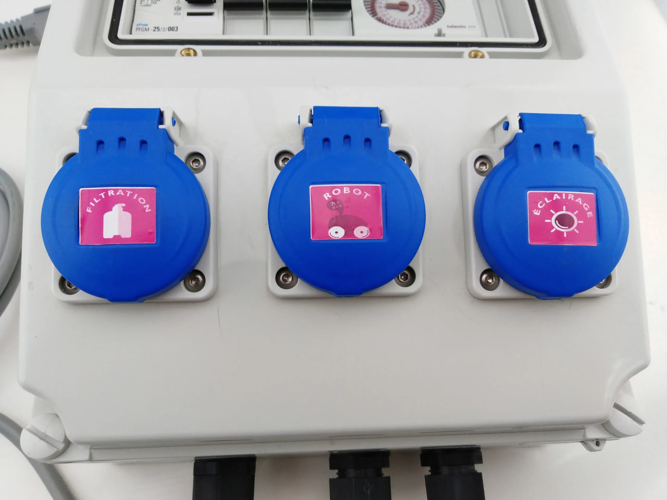 - Connexion 3 sorties (filtration/robot/éclairage) sur prise femelle
