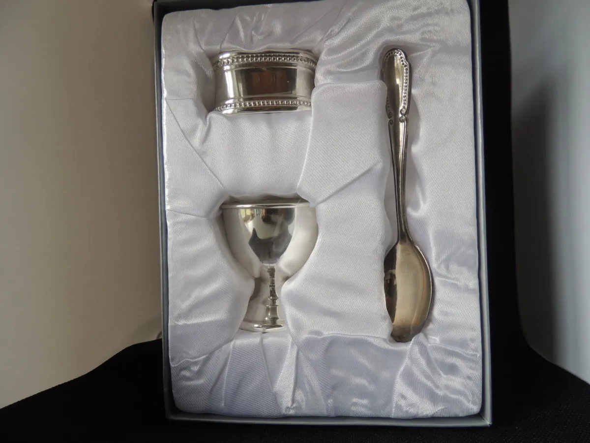 Coffret naissance comprenant un coquetier, rond de serviette et cuillère bébé, en métal argenté.