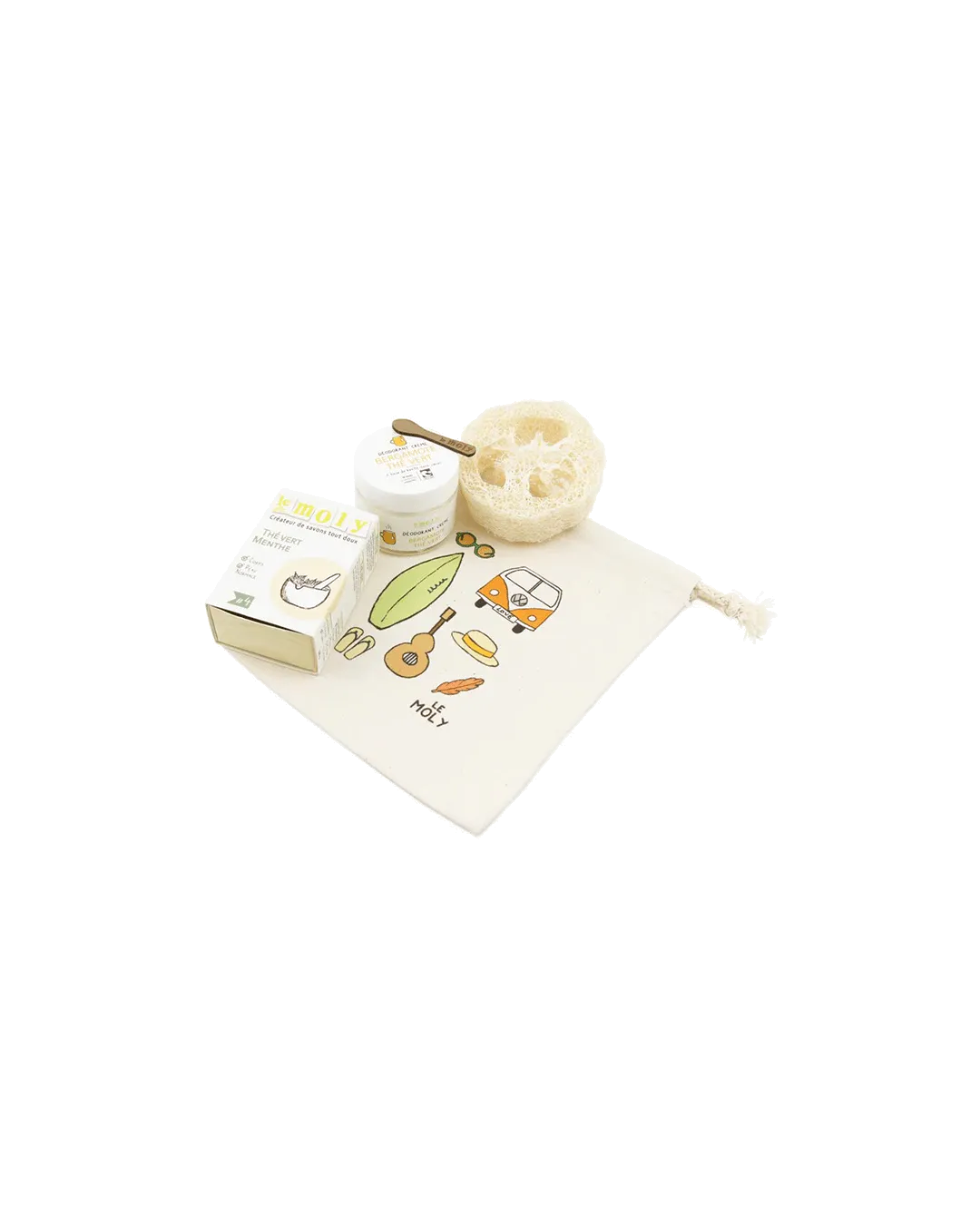 Chaque coffret a été soigneusement confectionné à la main, à Pau, dans les ateliers Le Moly. Un coffret contient les essentiels bien-être pour une peau douce et saine :