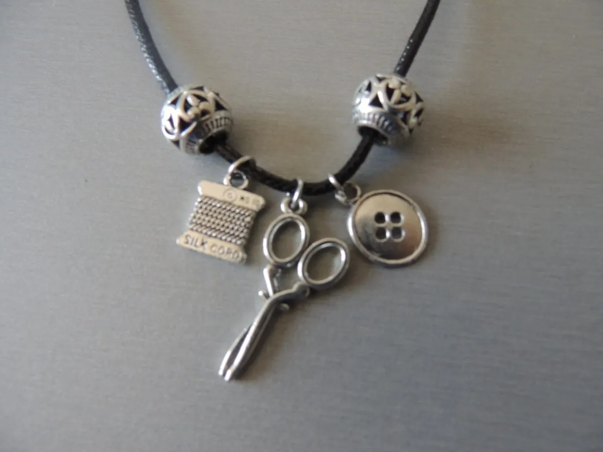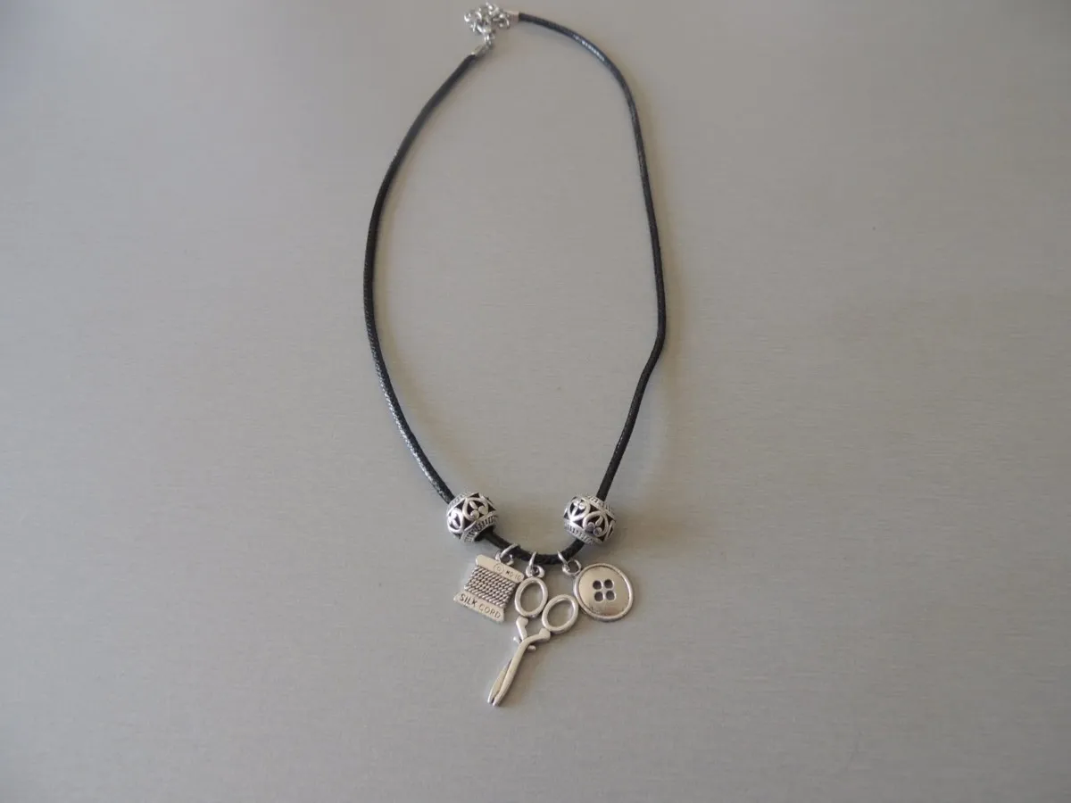 Collier cordon, pendentif thème couturière.