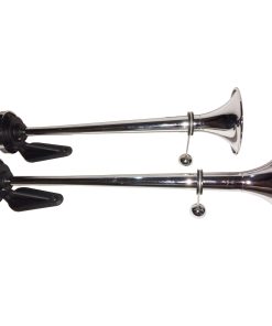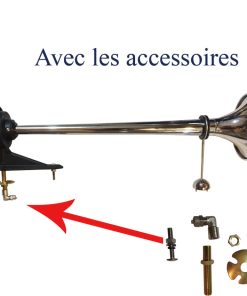 Avertisseur à air comprimé pour montage à l’extérieur. Son très puissant. Cornet en laiton chromé. L’ensemble comporte raccords de montage .