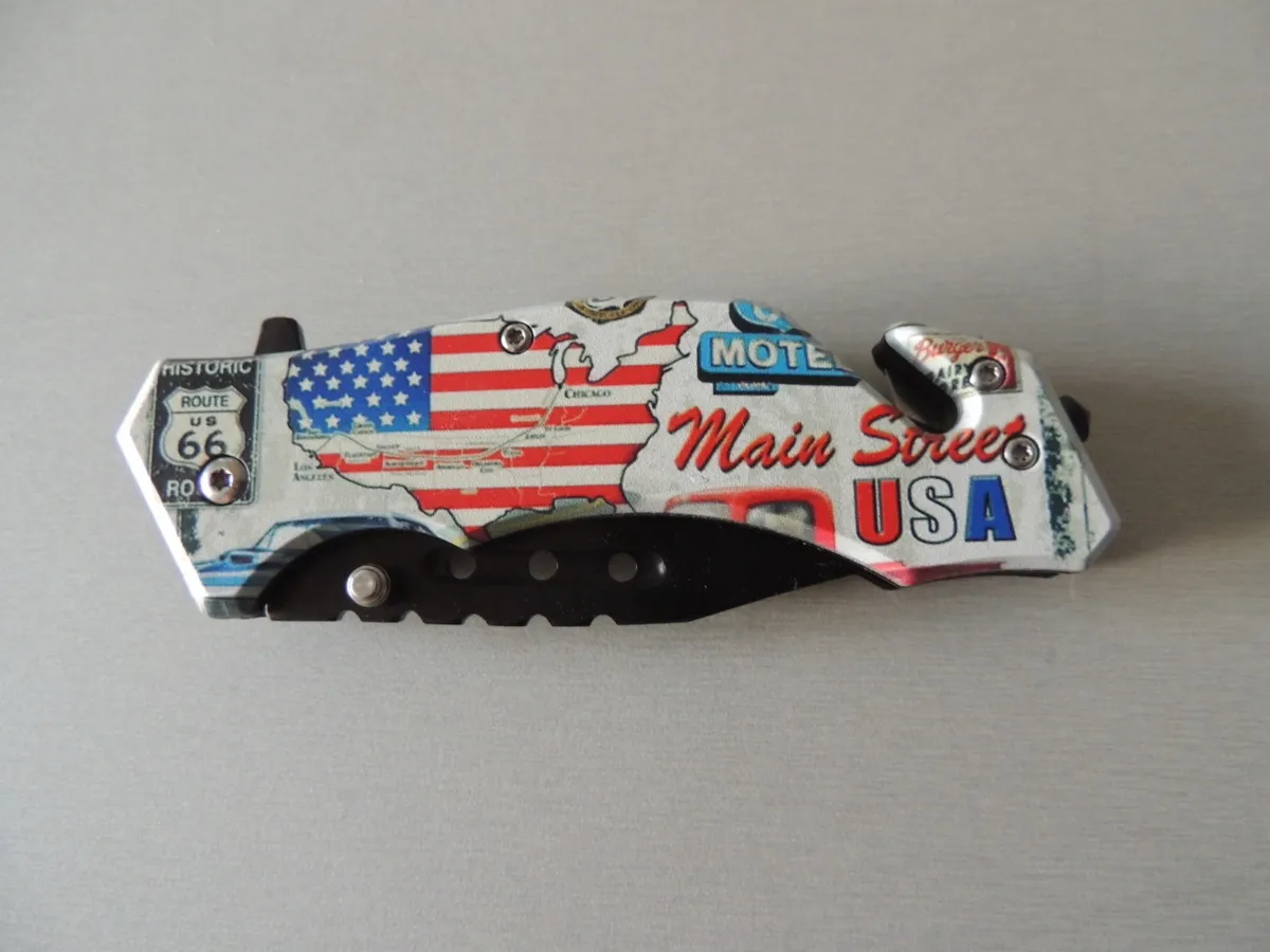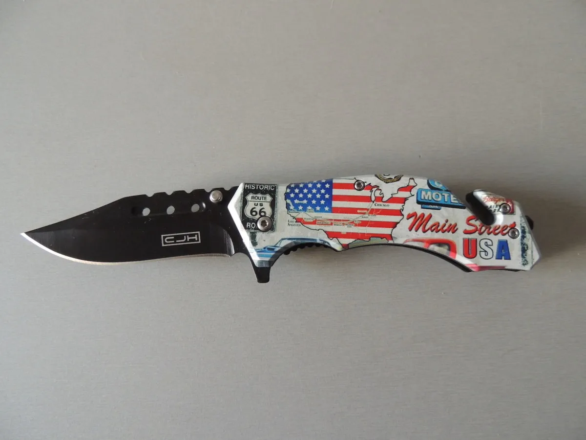 Manche en plastique en acier inoxydable AISI 420 avec imprimé motif drapeau USA (face avant) lame 8,3 cm total 19,8 cm poids 113 gr ouverture avec bloc flipper liner lockclip tip-down;
