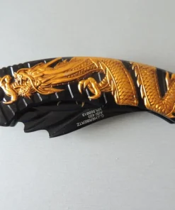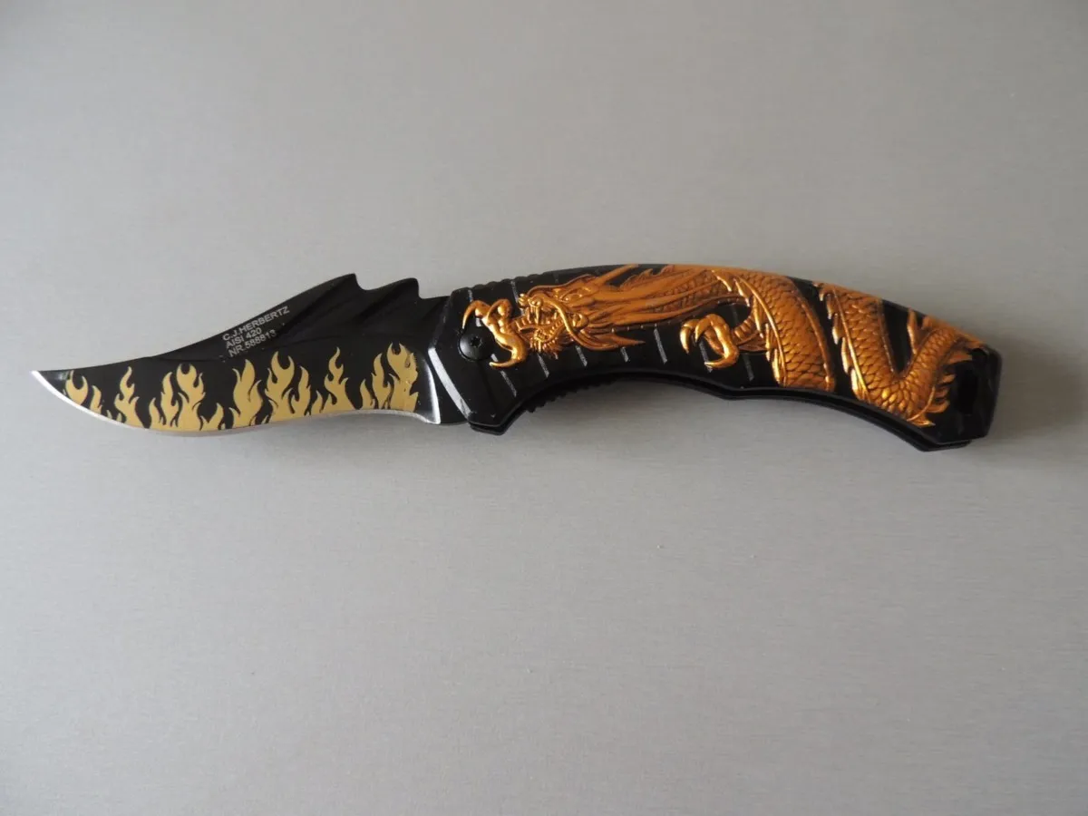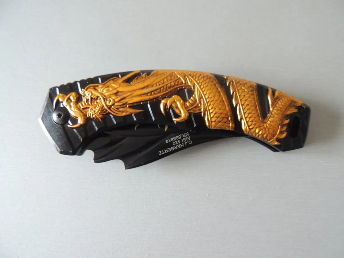 Couteaux de poche Herbertz 588813, manche décor dragon doré, lame acier inoxydable 420 à cran intérieur.