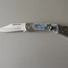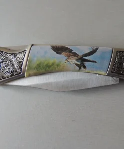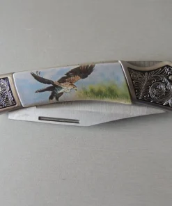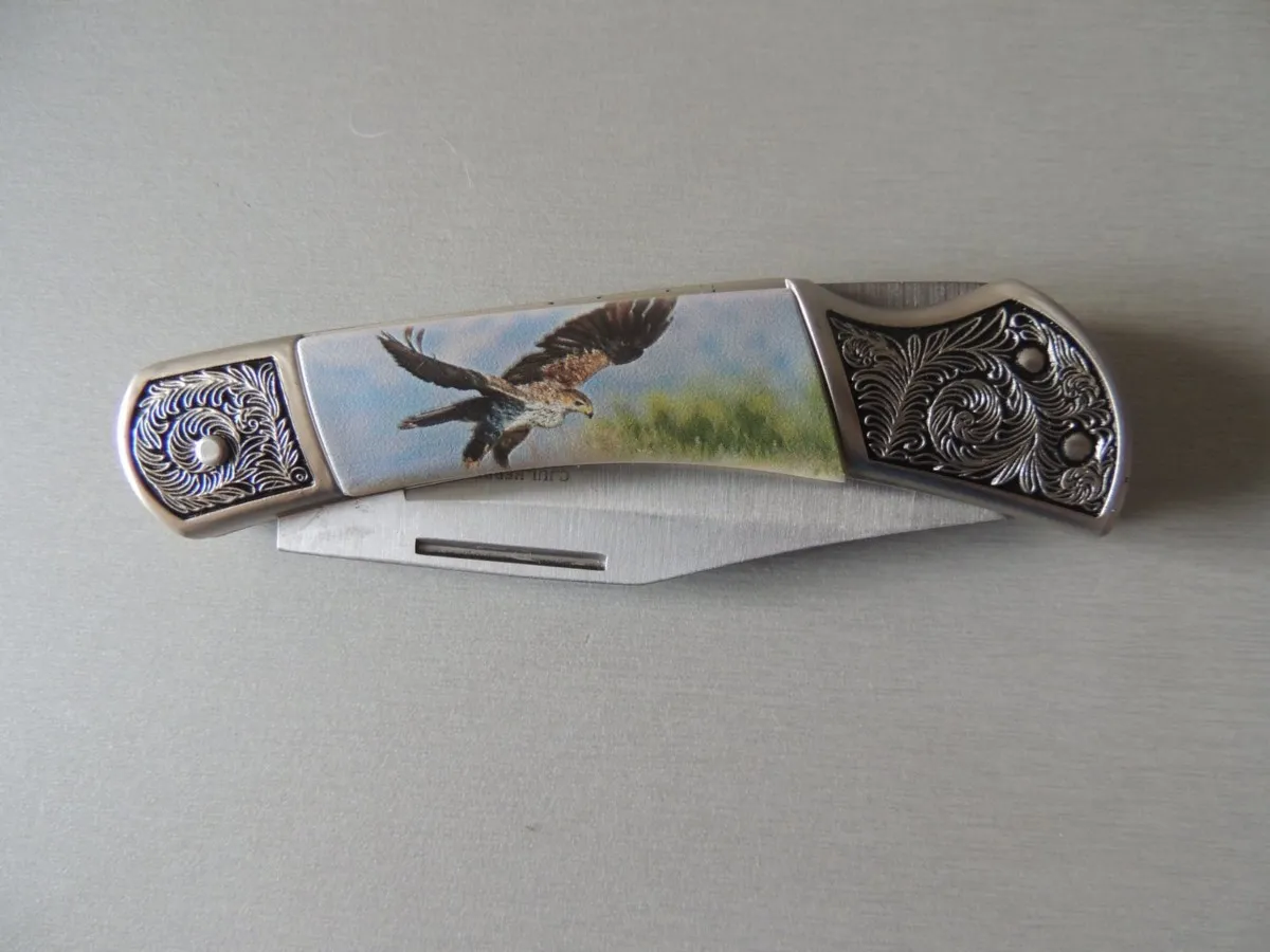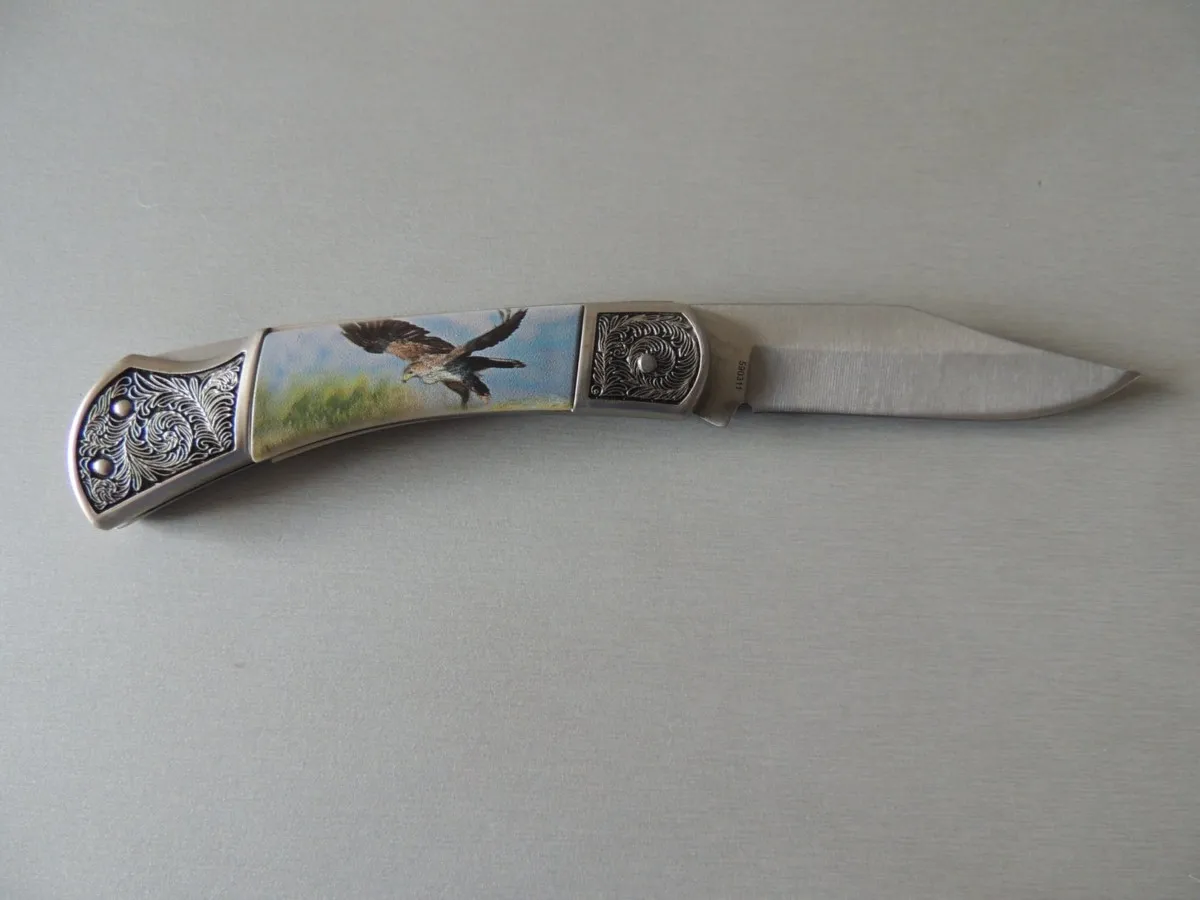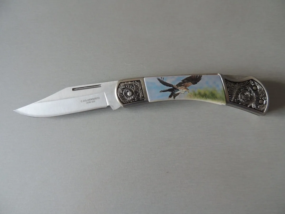 Couteau de poche Herbertz 590311, manche en acier inox avec motif et inserts décor de l’Aigle en couleur , lame acier inoxydable 420 à cran ( Bouton sur dessus du couteau).