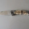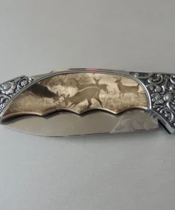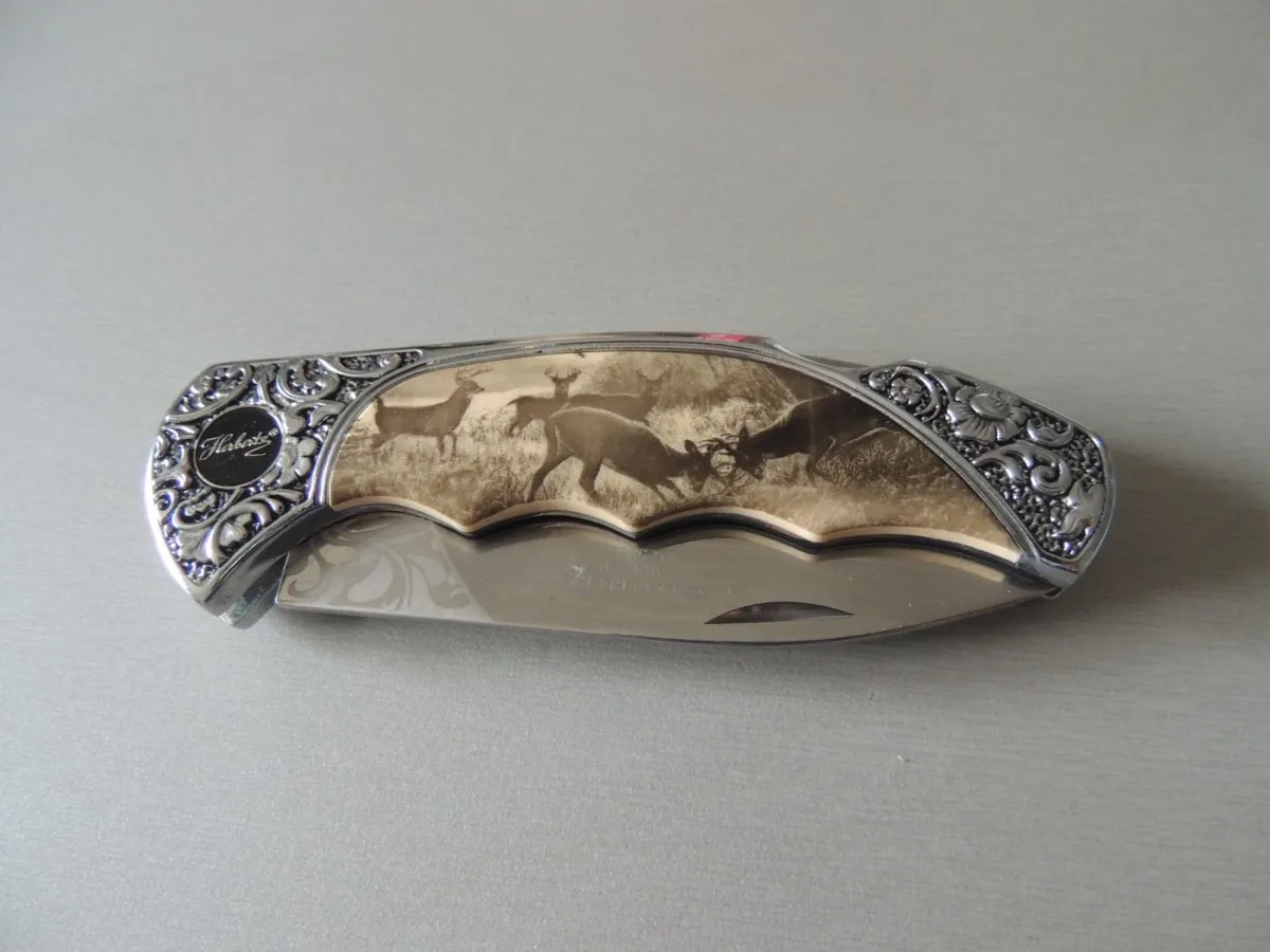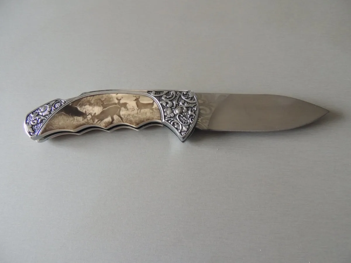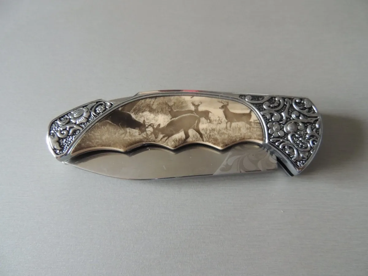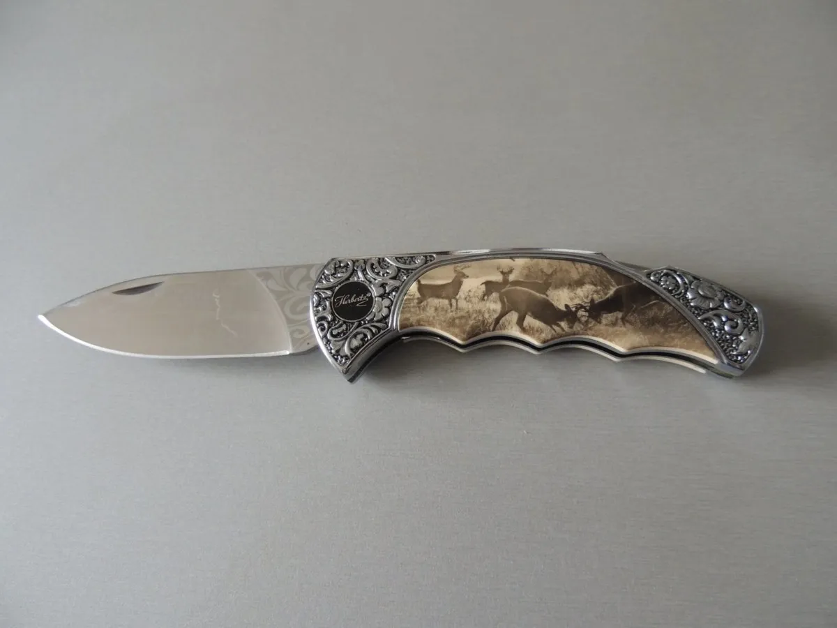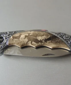 Couteau de poche Herbertz 588511, manche en acier inox avec motif floral et inserts décor cerfs , lame acier inoxydable 420 à cran ( Bouton sur dessus du couteau).