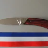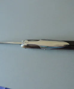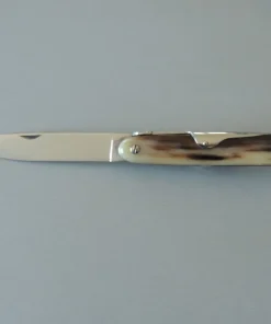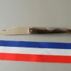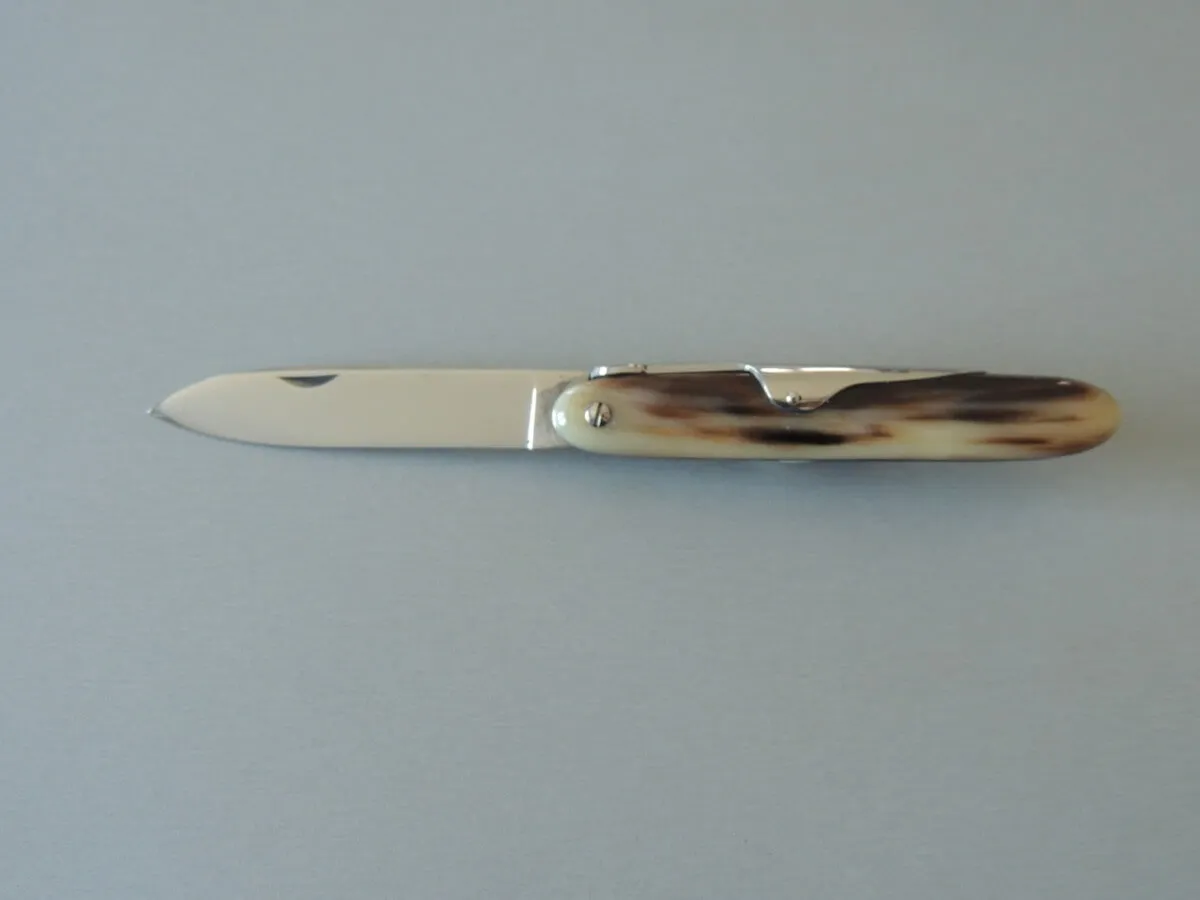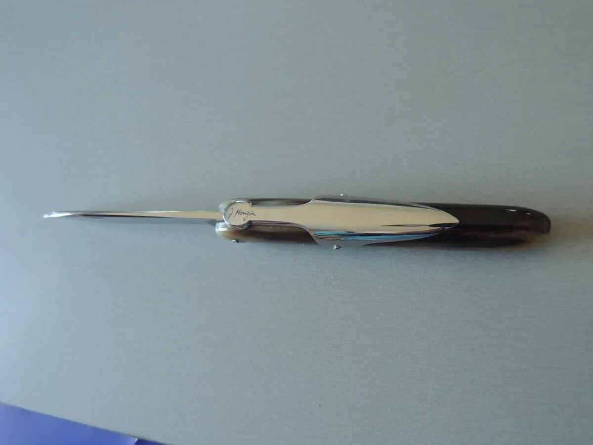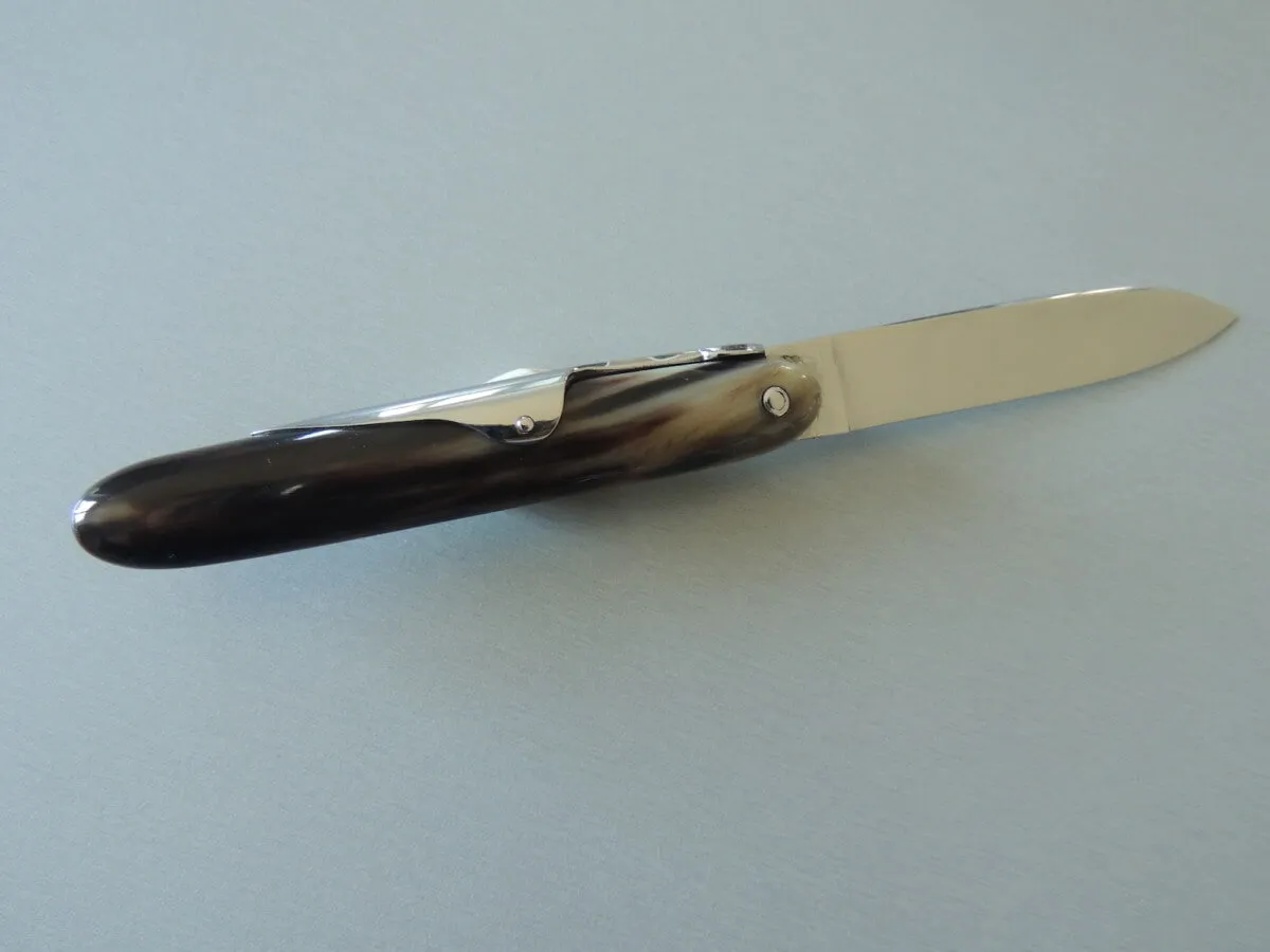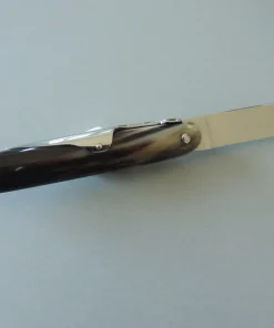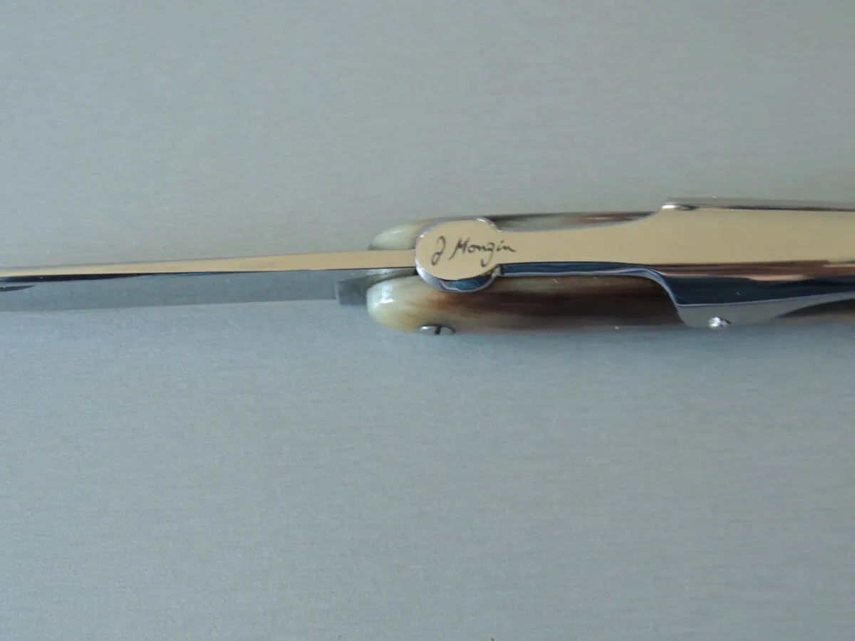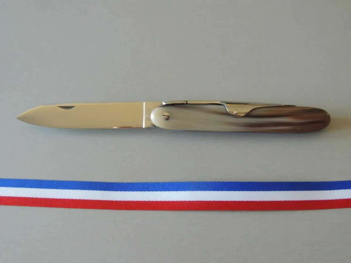 Couteau Navette sans anneaux, en corne blonde flammée par Jacques Mongin.