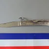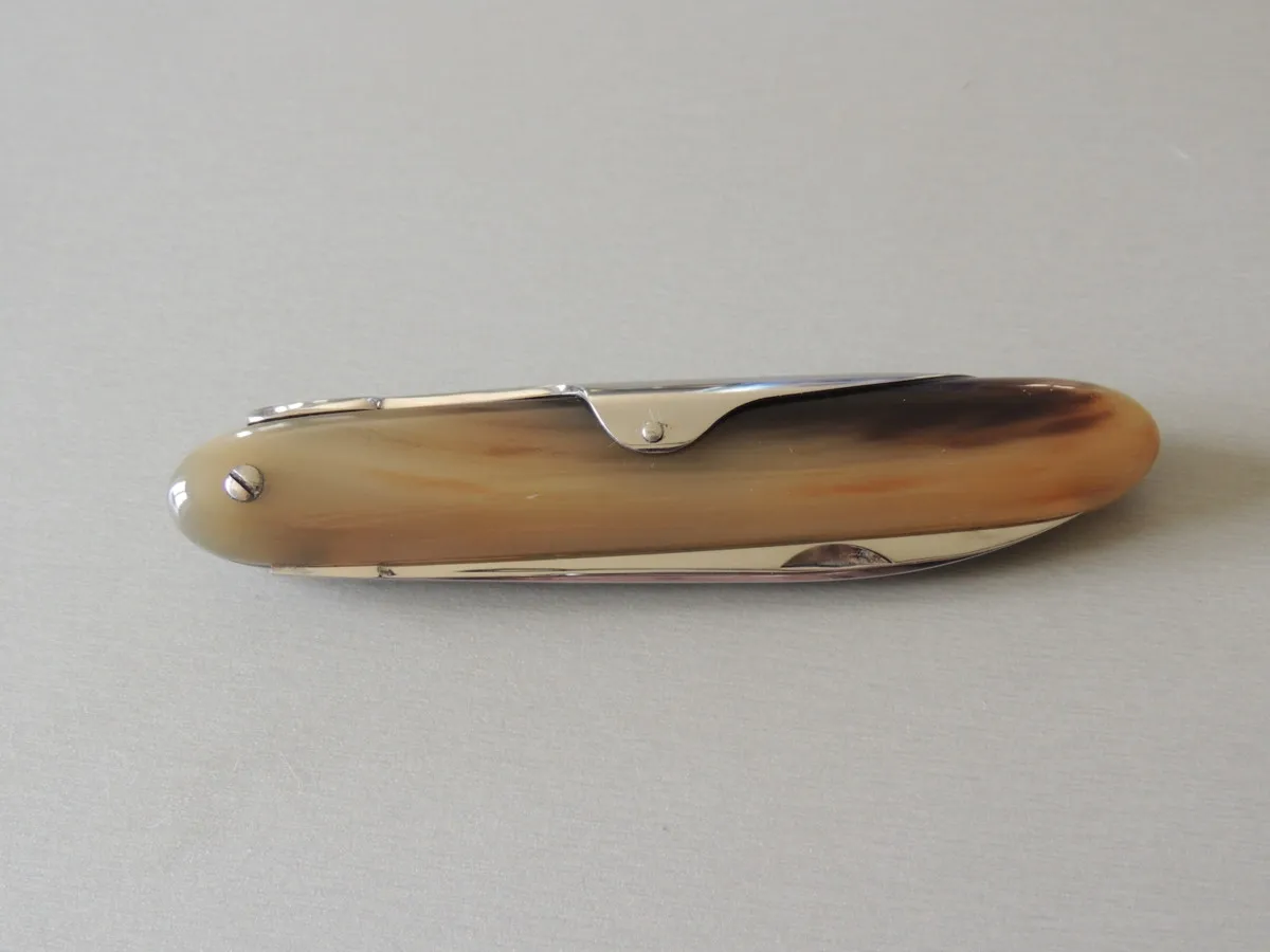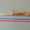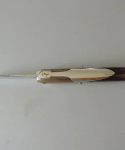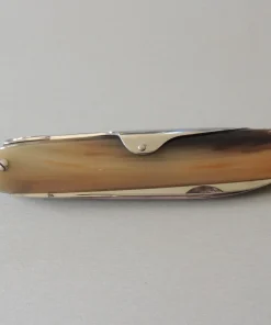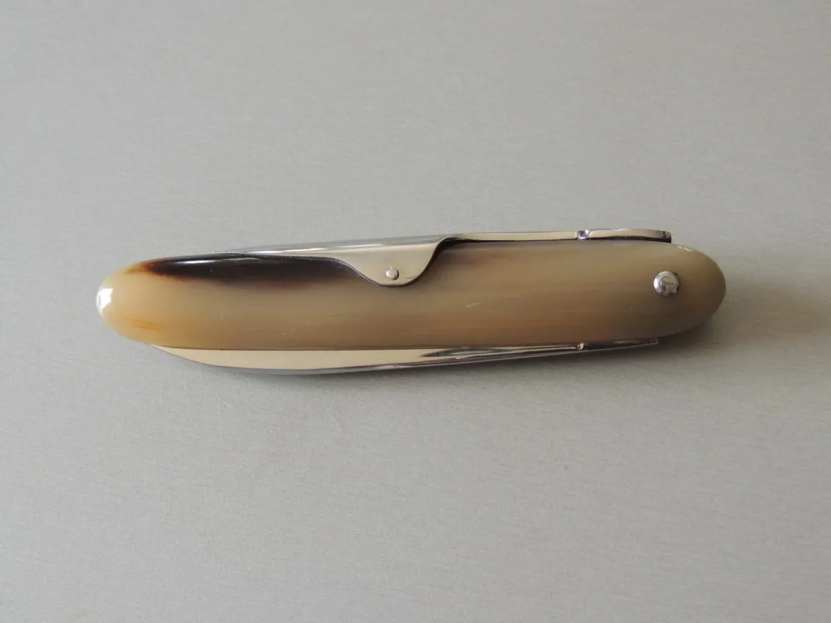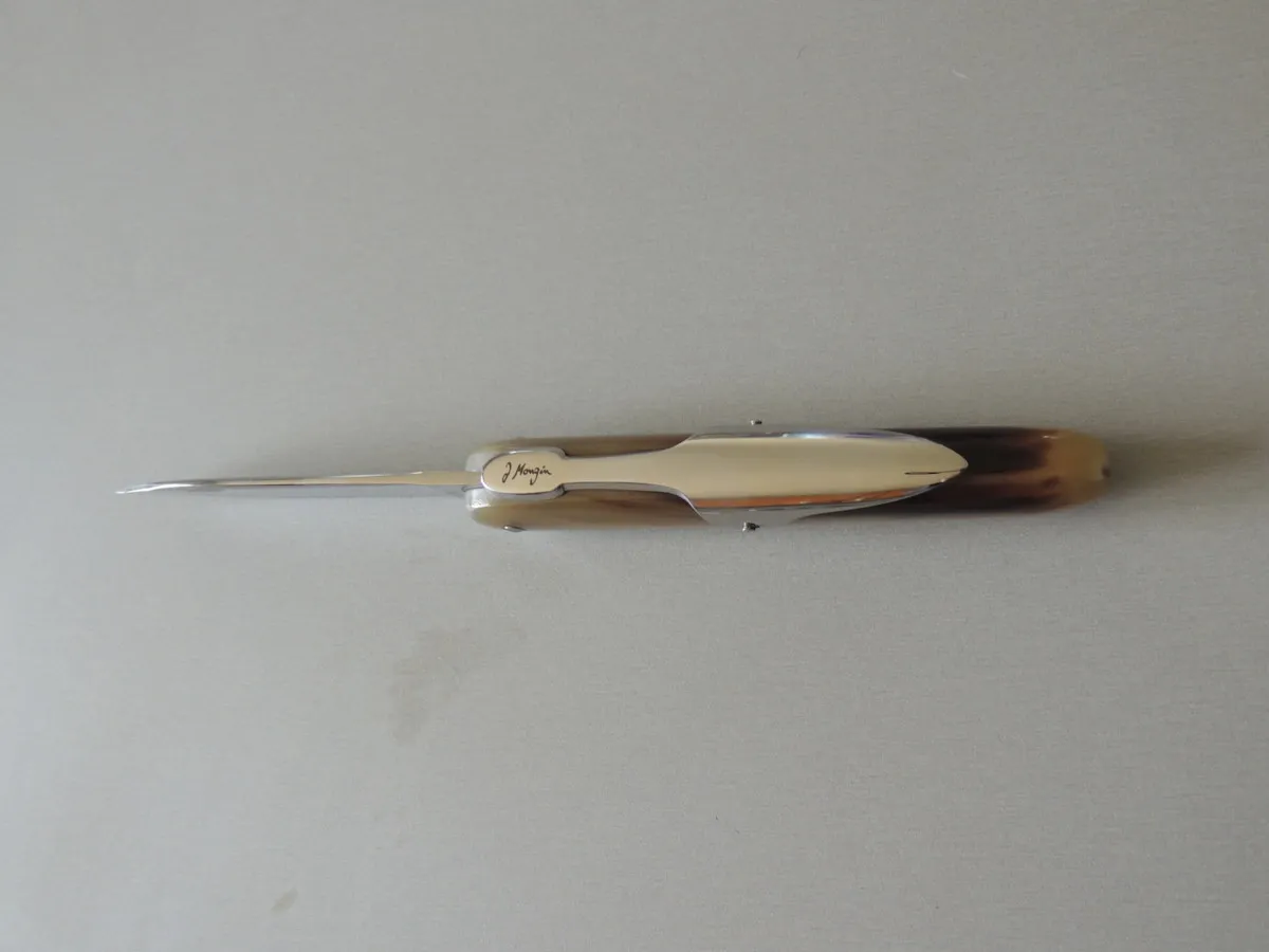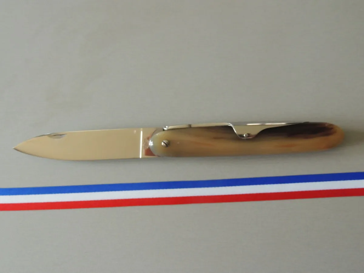 Couteau Navette sans anneaux, en corne blonde flammée par Jacques Mongin.