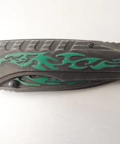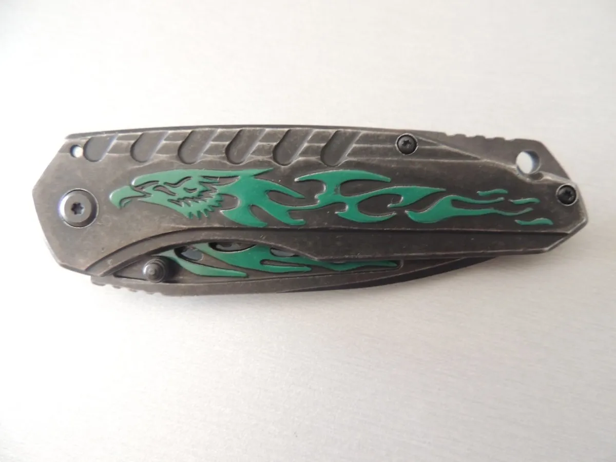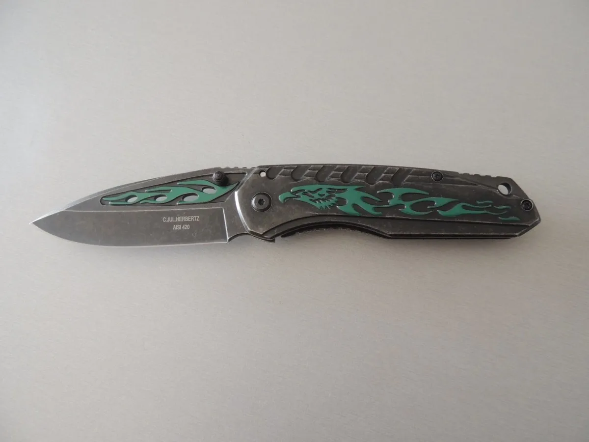 Couteaux de poche Herbertz 568712, manche noir décor aigle vert, lame acier inoxydable 420 à cran intérieur.