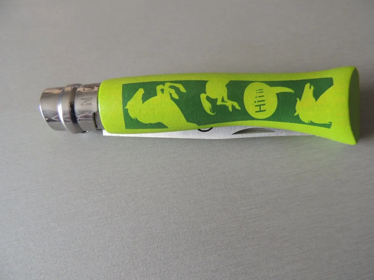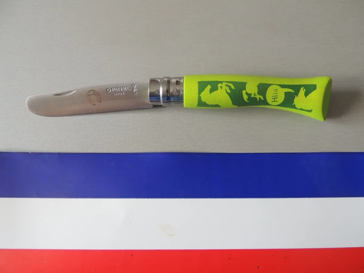 Couteaux enfant Opinel, manche bois teinté vert, motif cheval n°7.