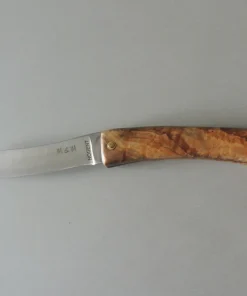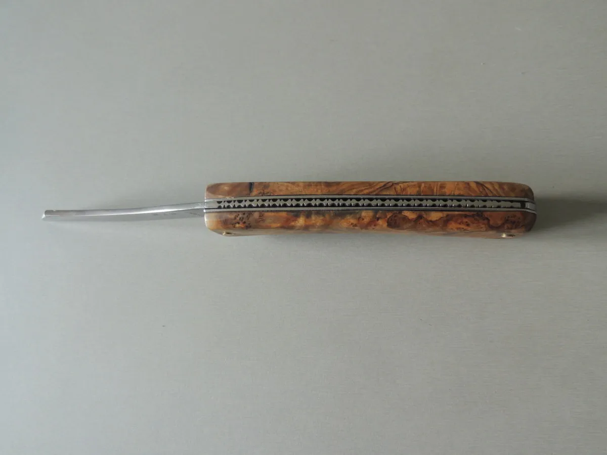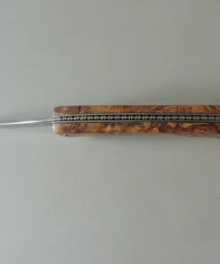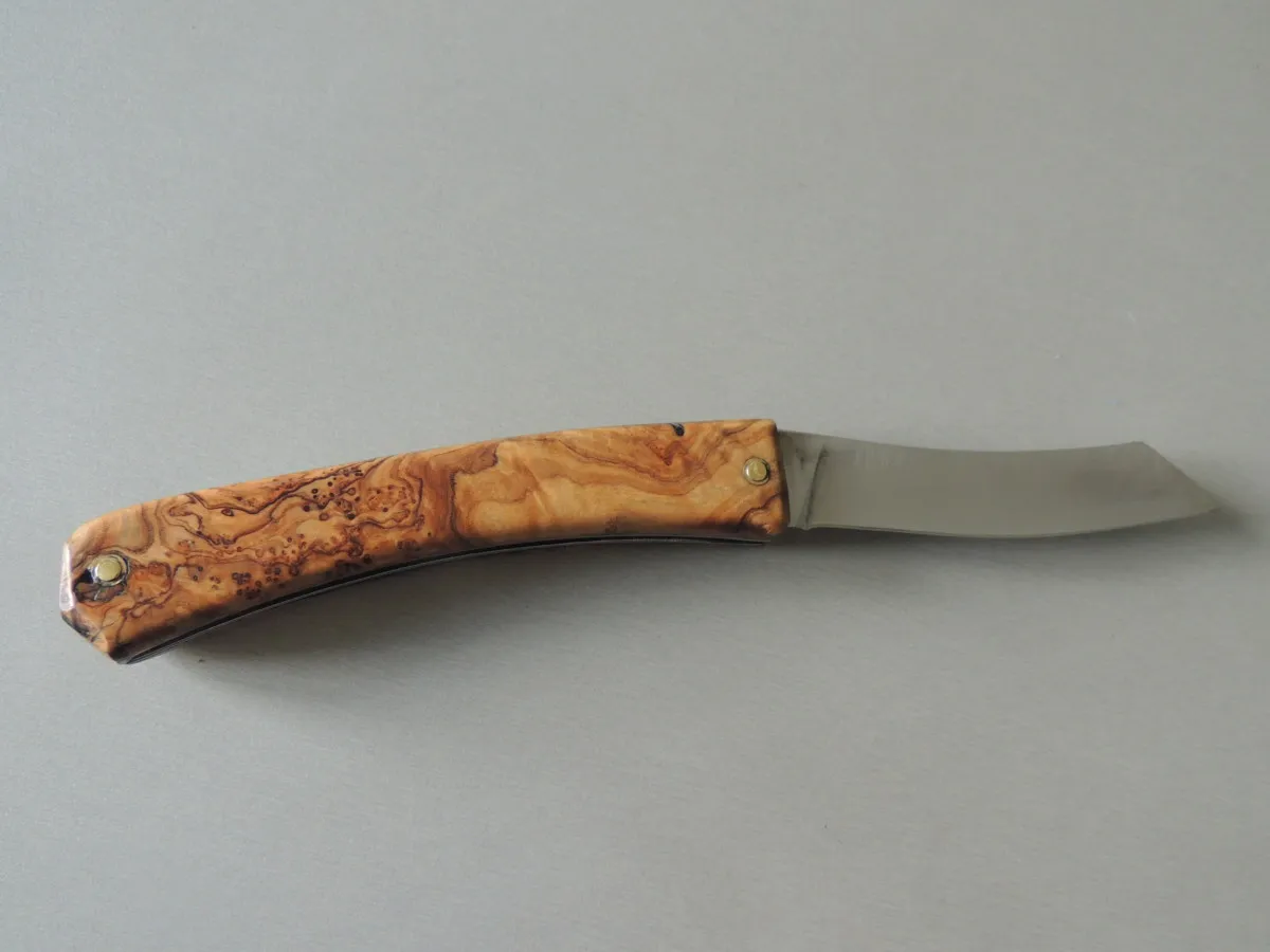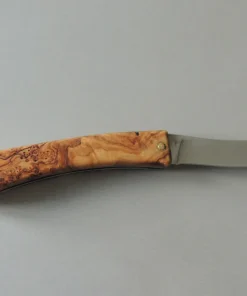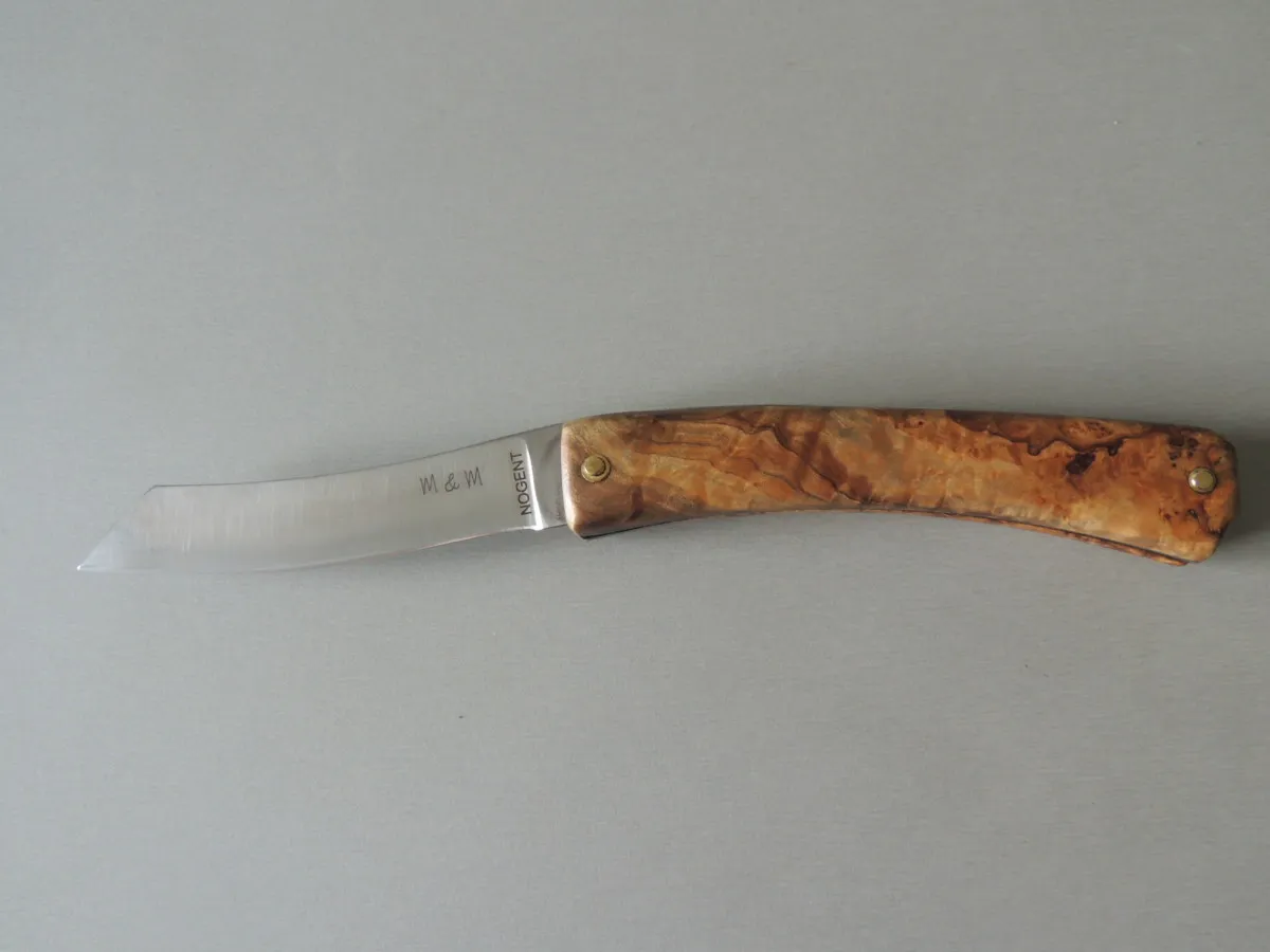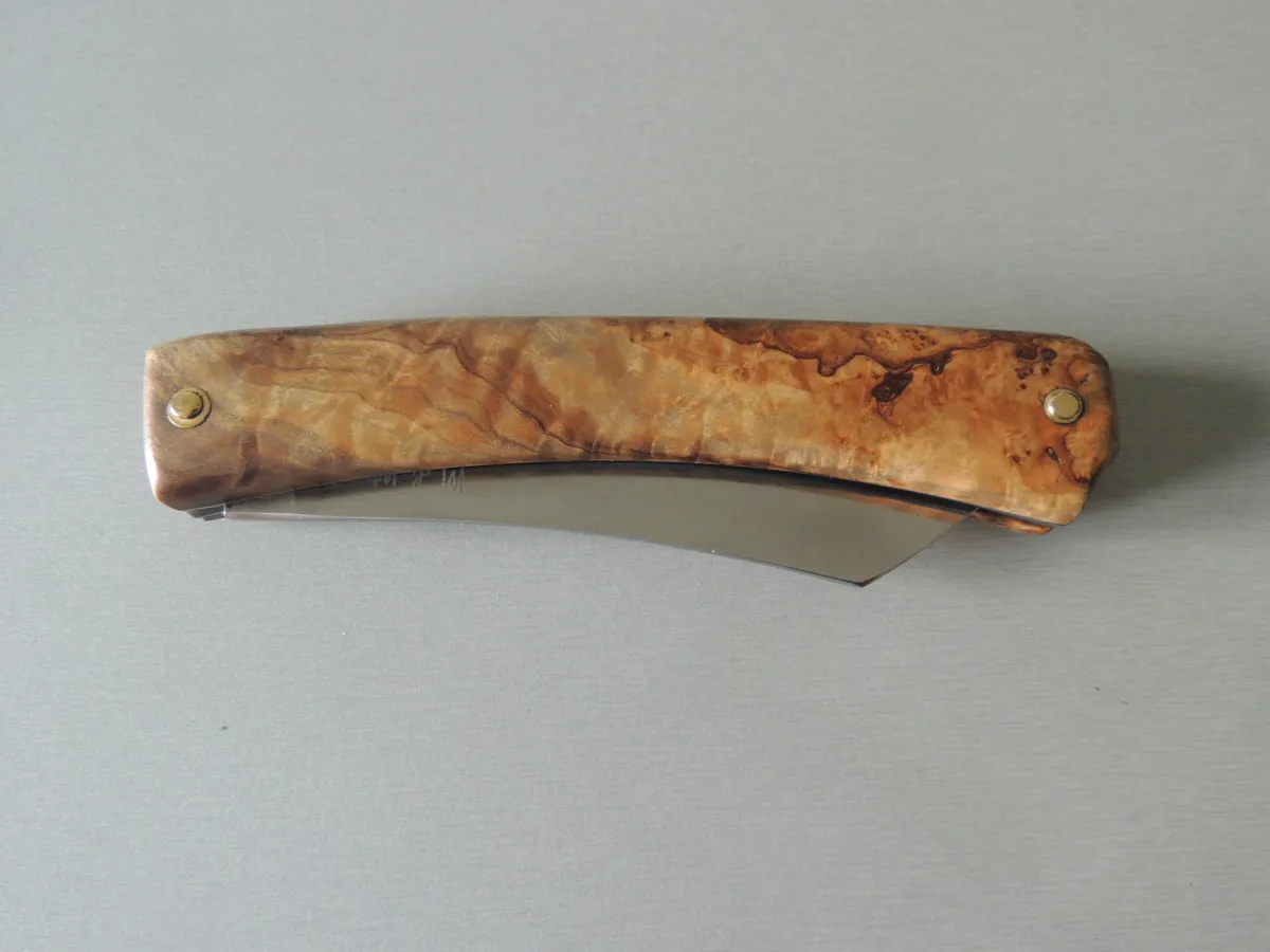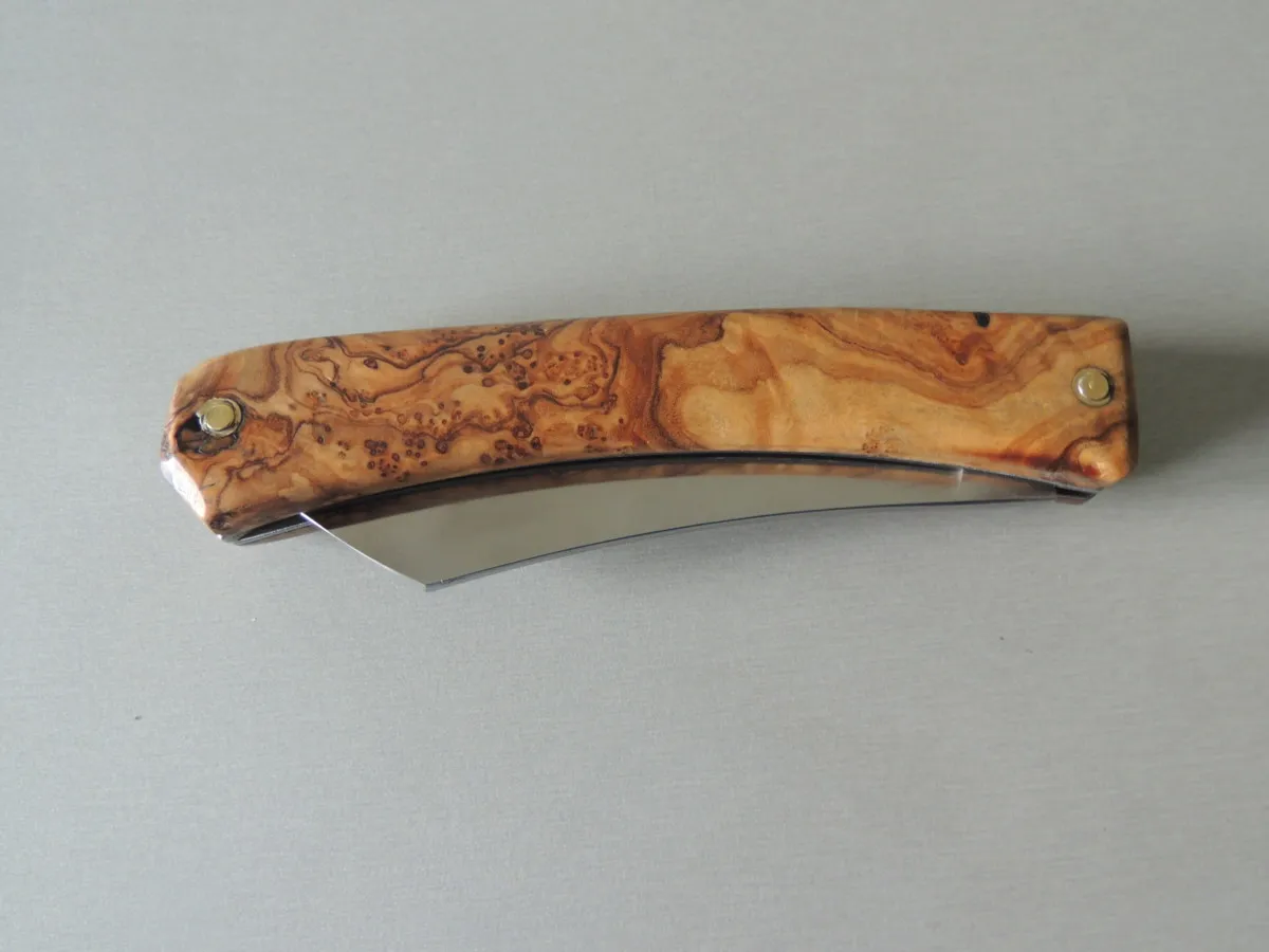 Couteau par M & M, lame carbone, manche en loupe d’olivier, 1 pièce.