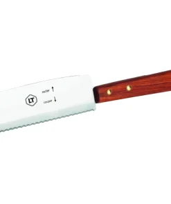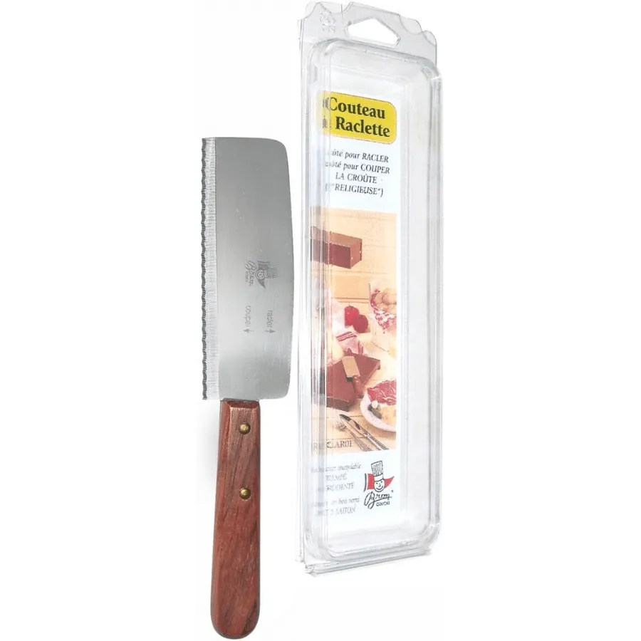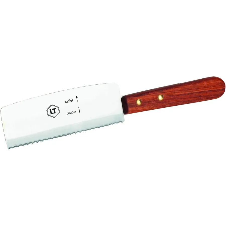 Couteau spécial raclette pour racler et couper facilement le fromage. 2 lames : lisse et dentelée. Lame en inox trempé. Manche en bois verni.