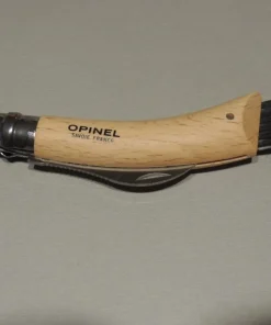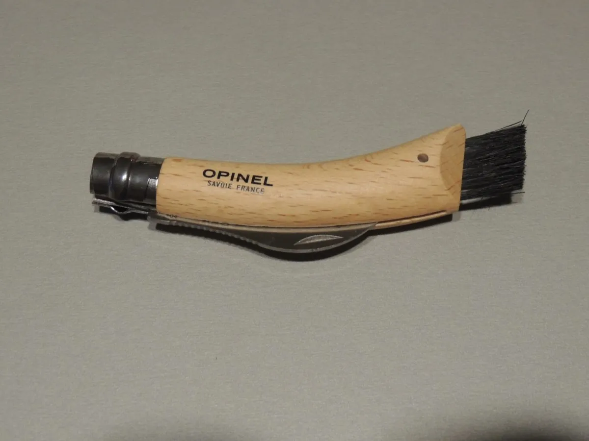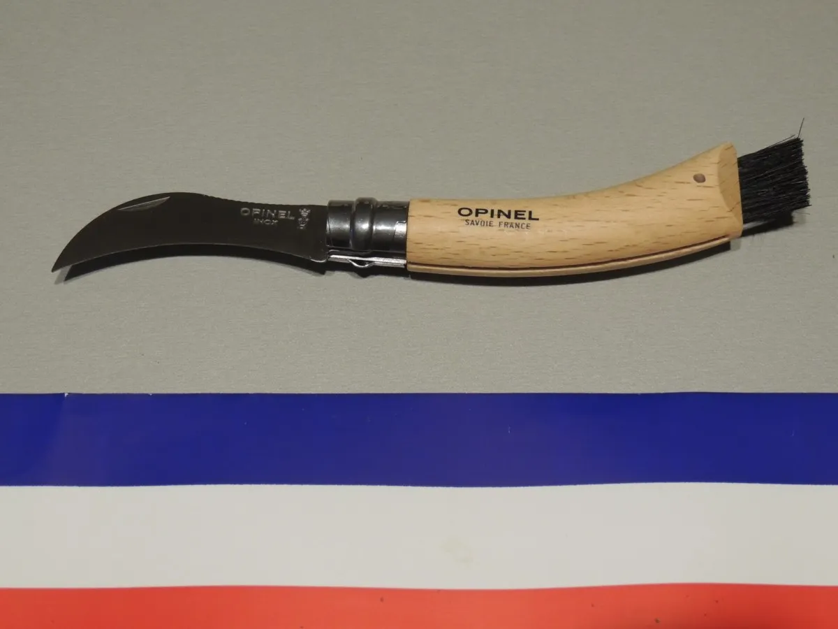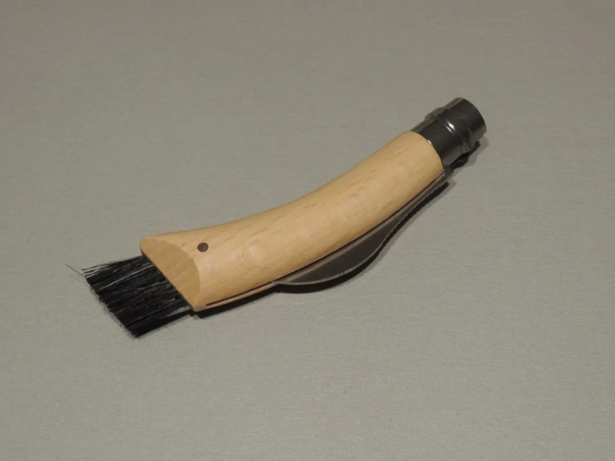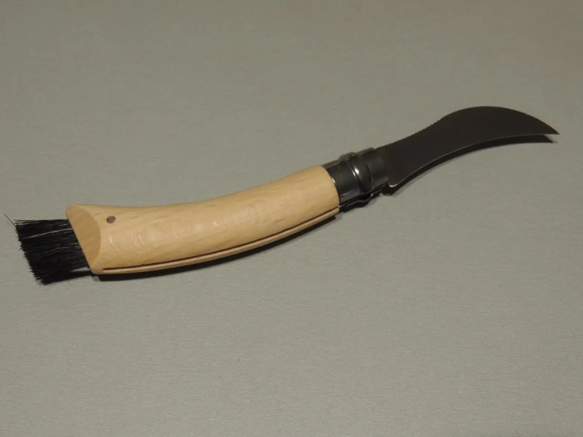 Couteau à champignons Opinel , lame inox de 8 cm est courbe pour faciliter la coupe. Son dos denté permet de gratter et nettoyer le champignon., manche en Hêtre vernis avec brosse en bout.