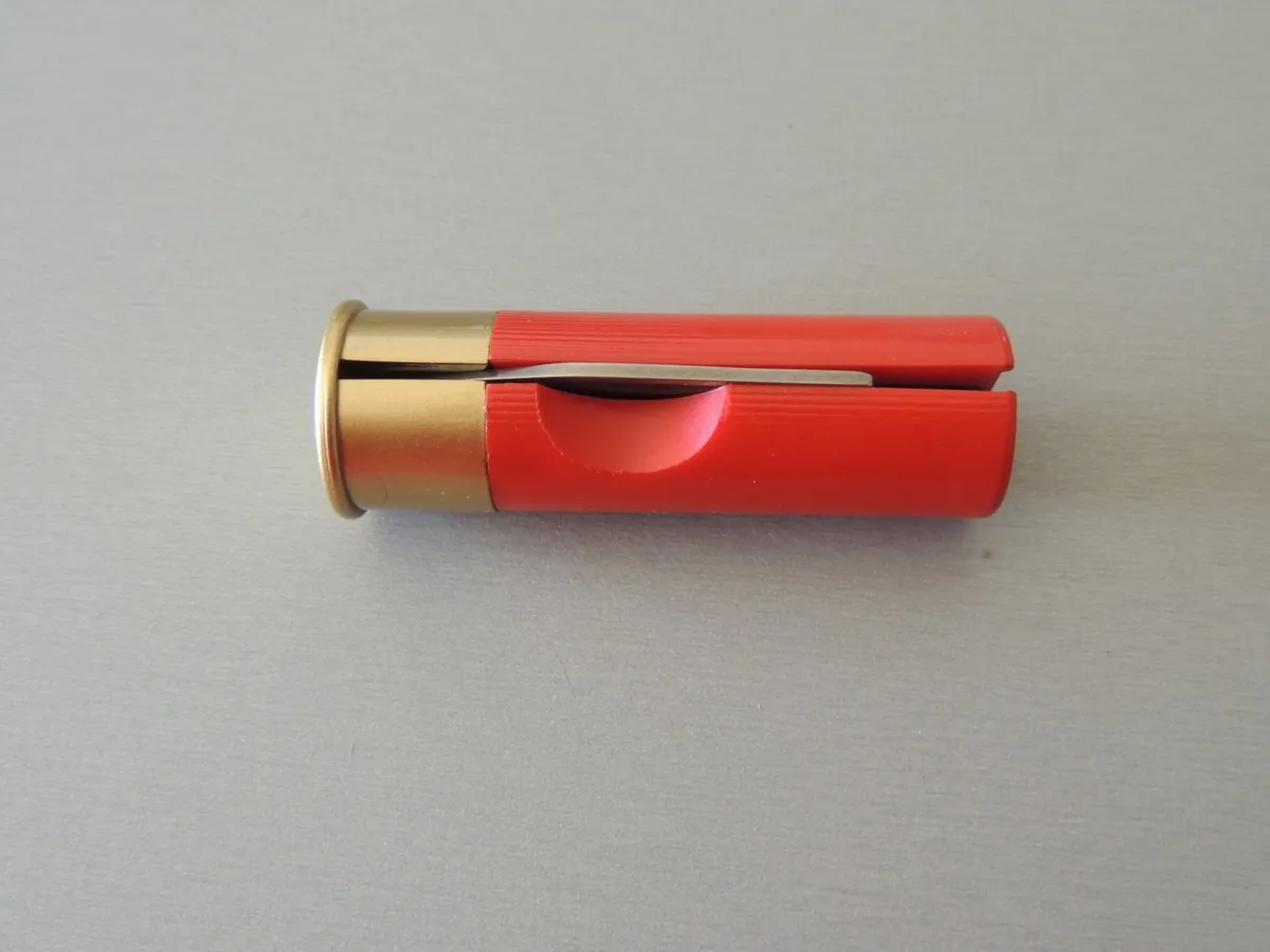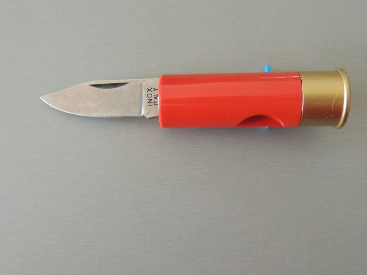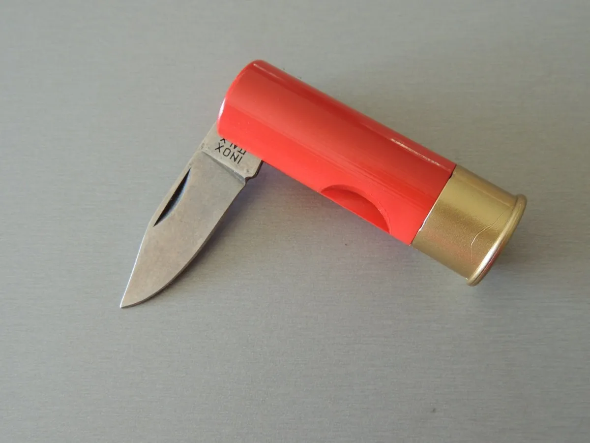 Couteaux cartouche rouge, véritable cartouche de fusil recyclée en petit couteaux de 6,5 cm fermé et 11,5 cm ouvert.