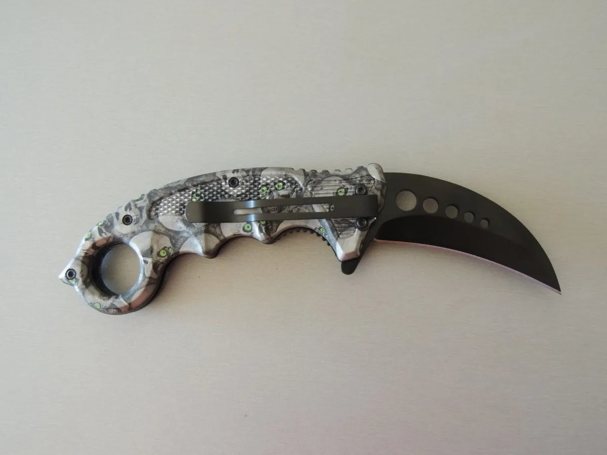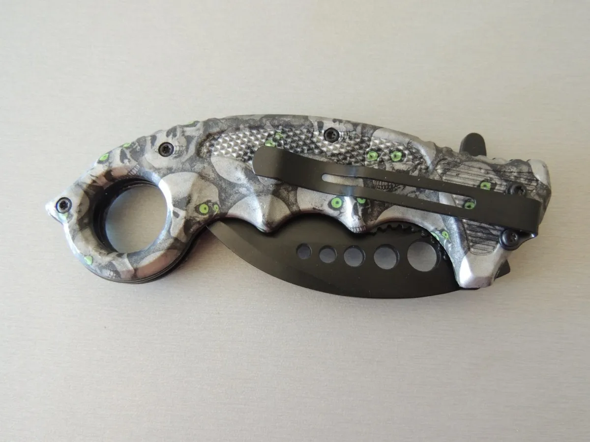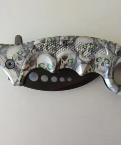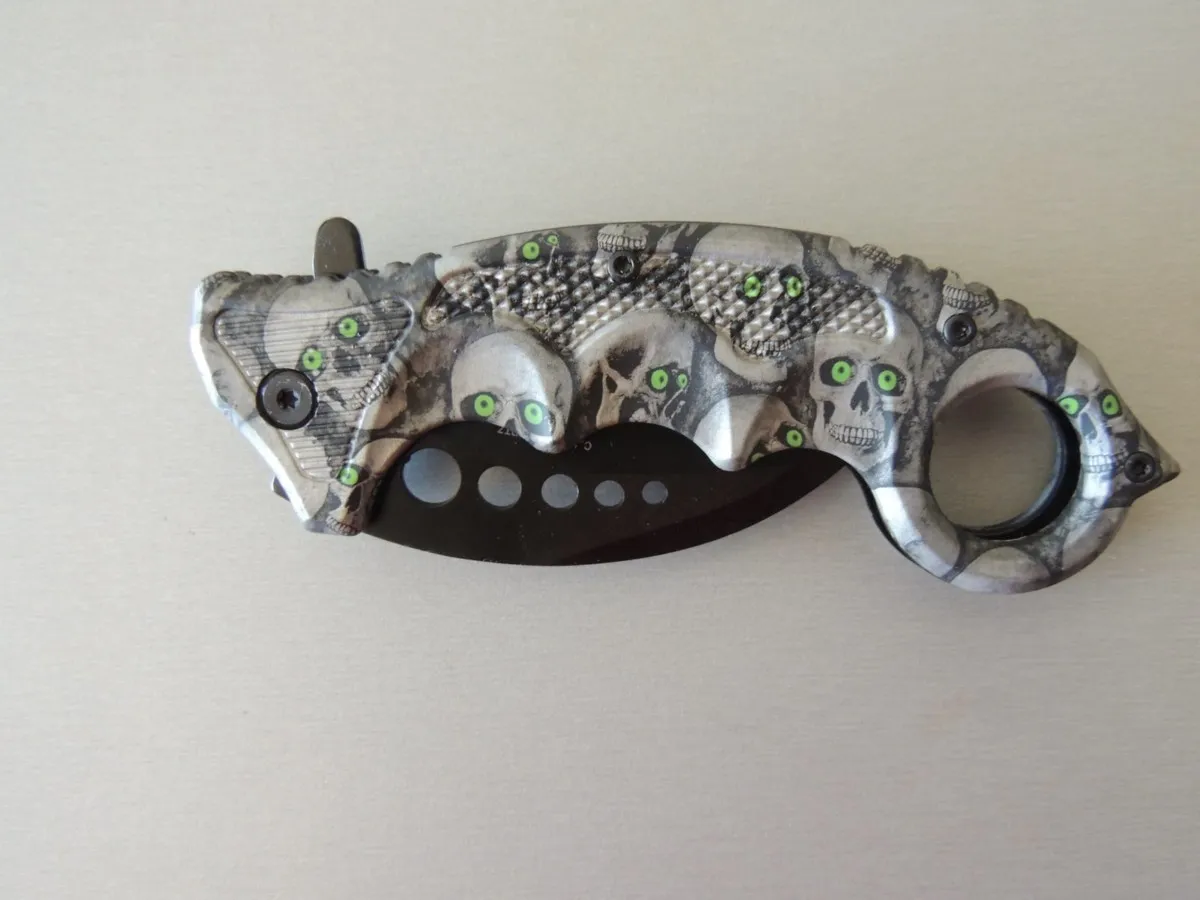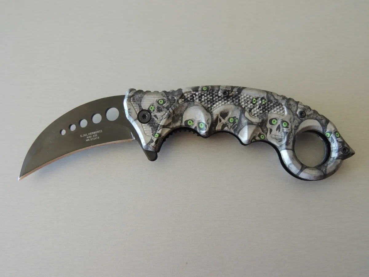 Couteaux de poche Herbertz 572413, manche karambit modèle tête de mort , lame acier inoxydable 420 revêtement titanium à cran intérieur.