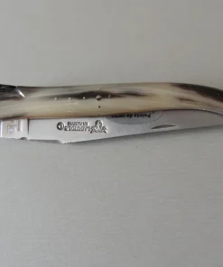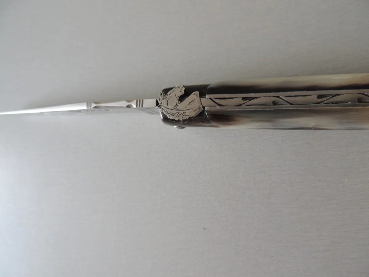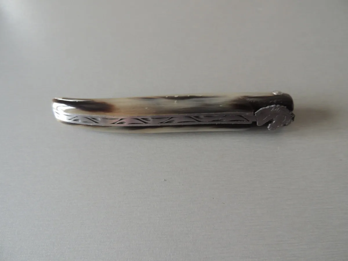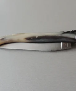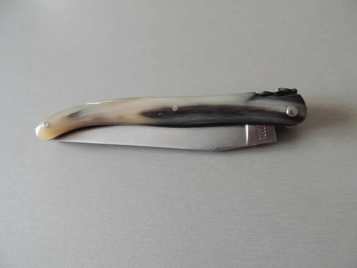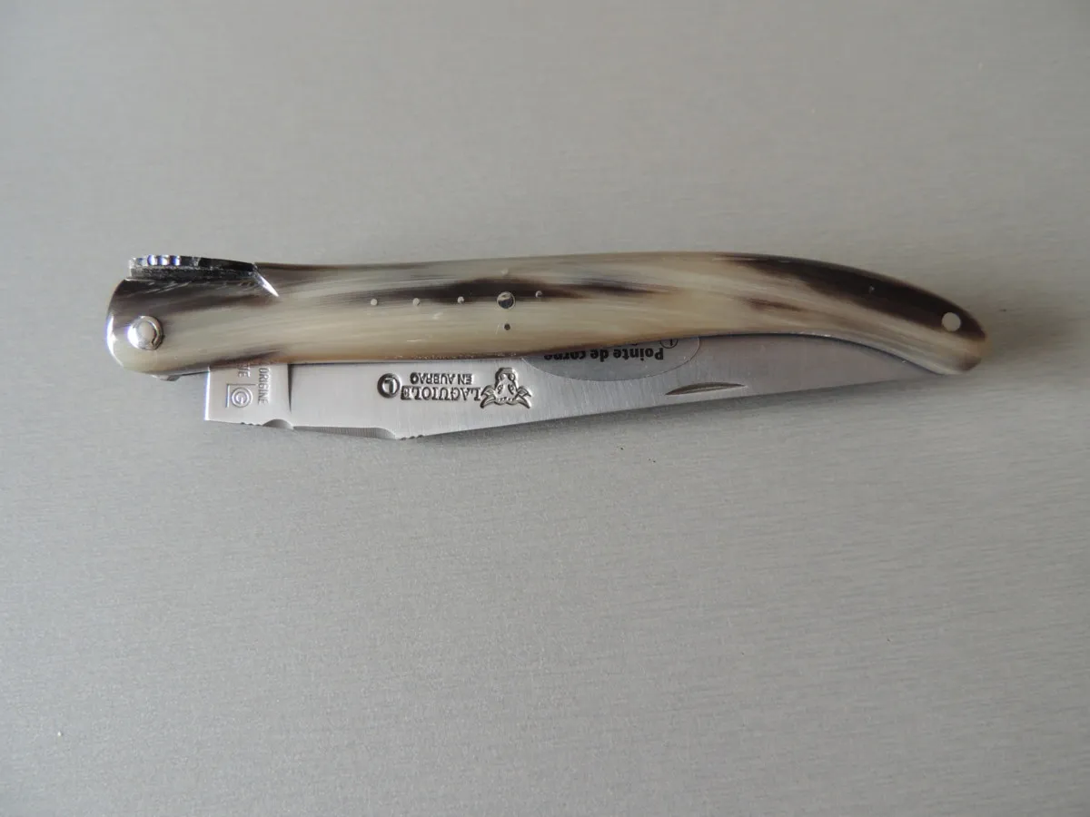 Laguiole en Aubrac, couteau artisanal mouche cheval forgé, pointe de corne blonde. Guilloché.