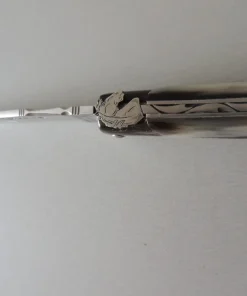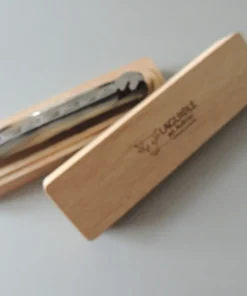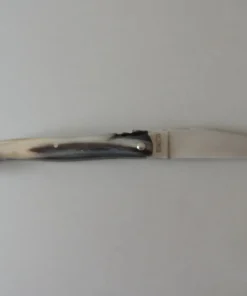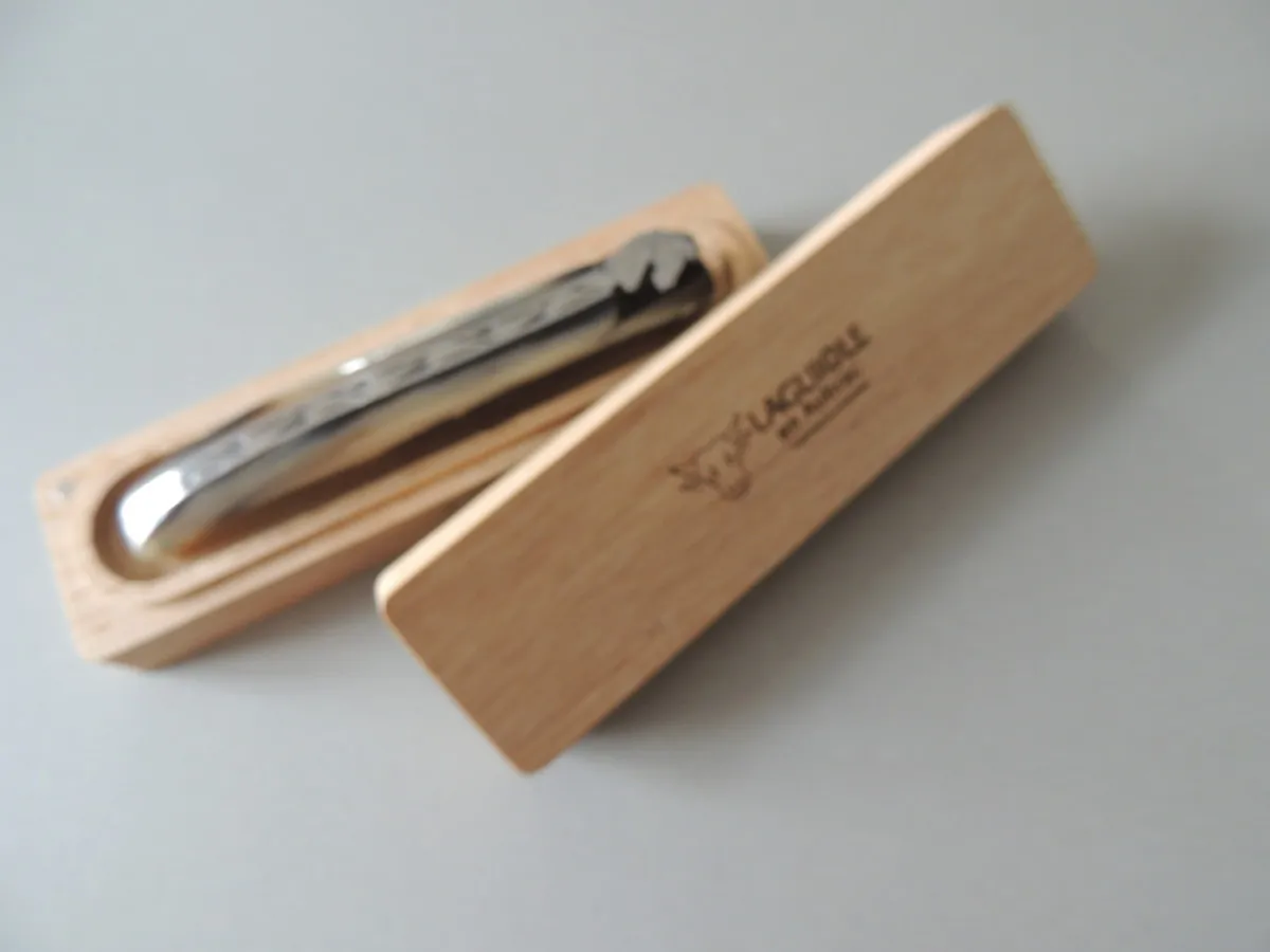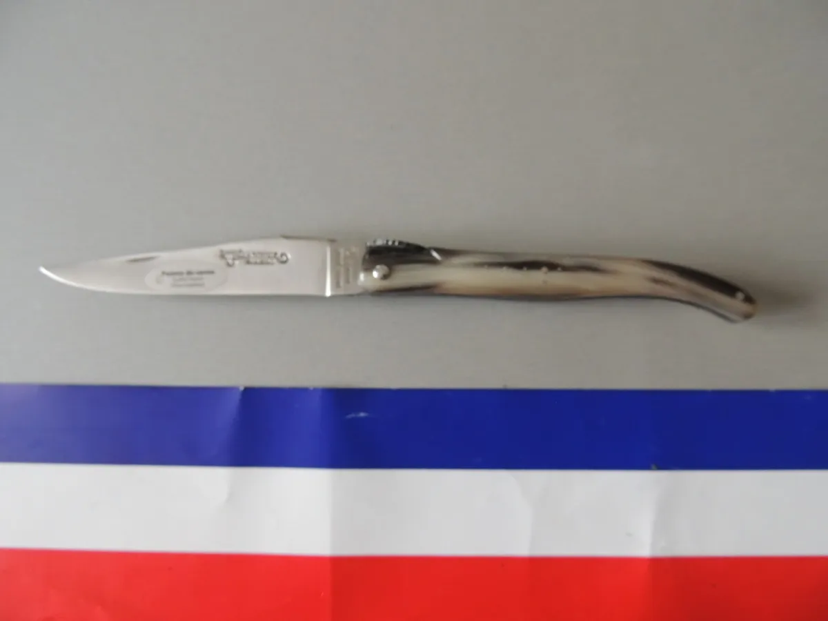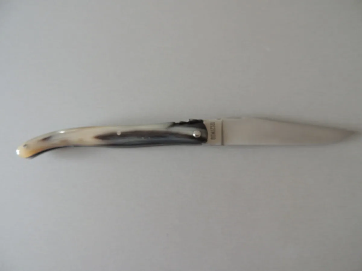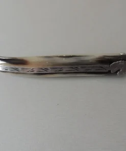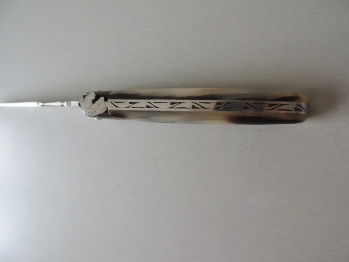 Laguiole en Aubrac, couteau artisanal mouche cheval forgé, pointe de corne blonde. Guilloché.