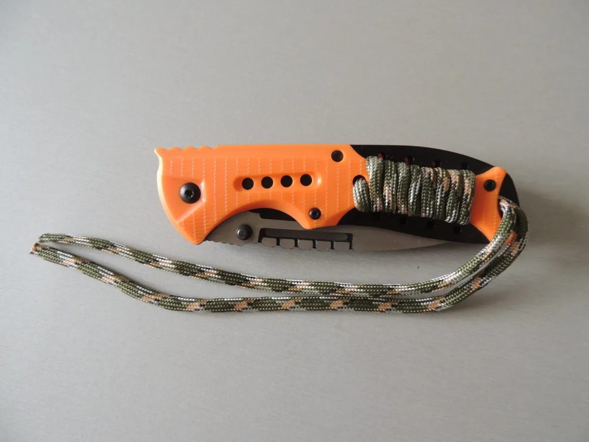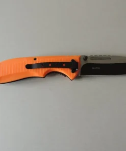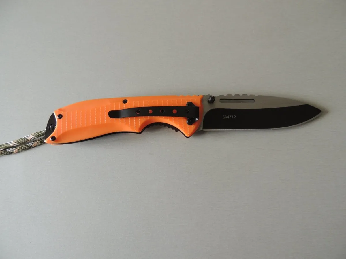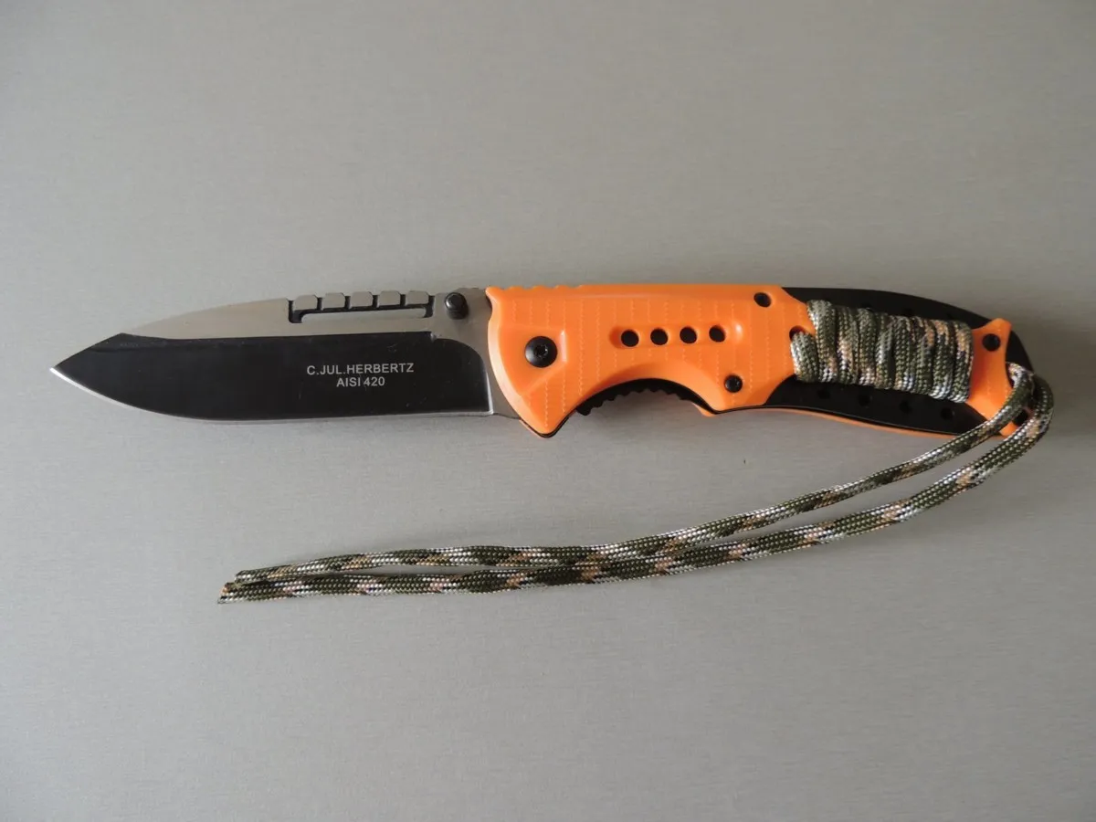 Couteaux de poche Herbertz 564712, manche 12 cm ABS orange avec clip et lacet paracord, lame noire à trou acier inoxydable 420 à cran intérieur et à bouton double.
