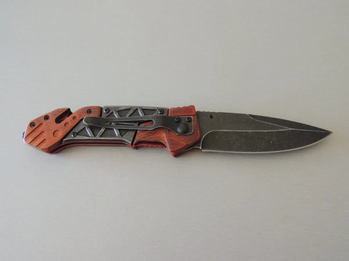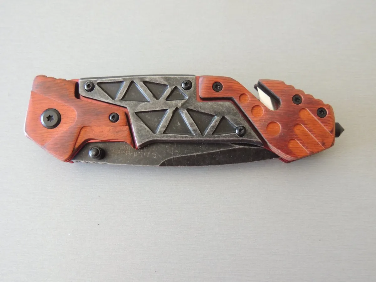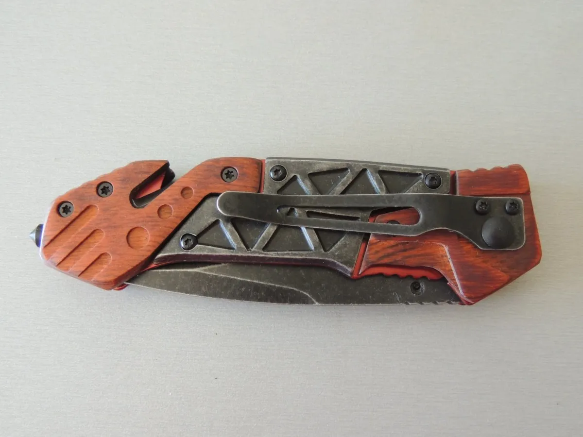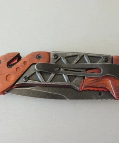 Manche de 12,5 cm, 21,5 cm ouvert. Avec clip, pic brise vitre en bout et coupe-ceinture de sécurité.